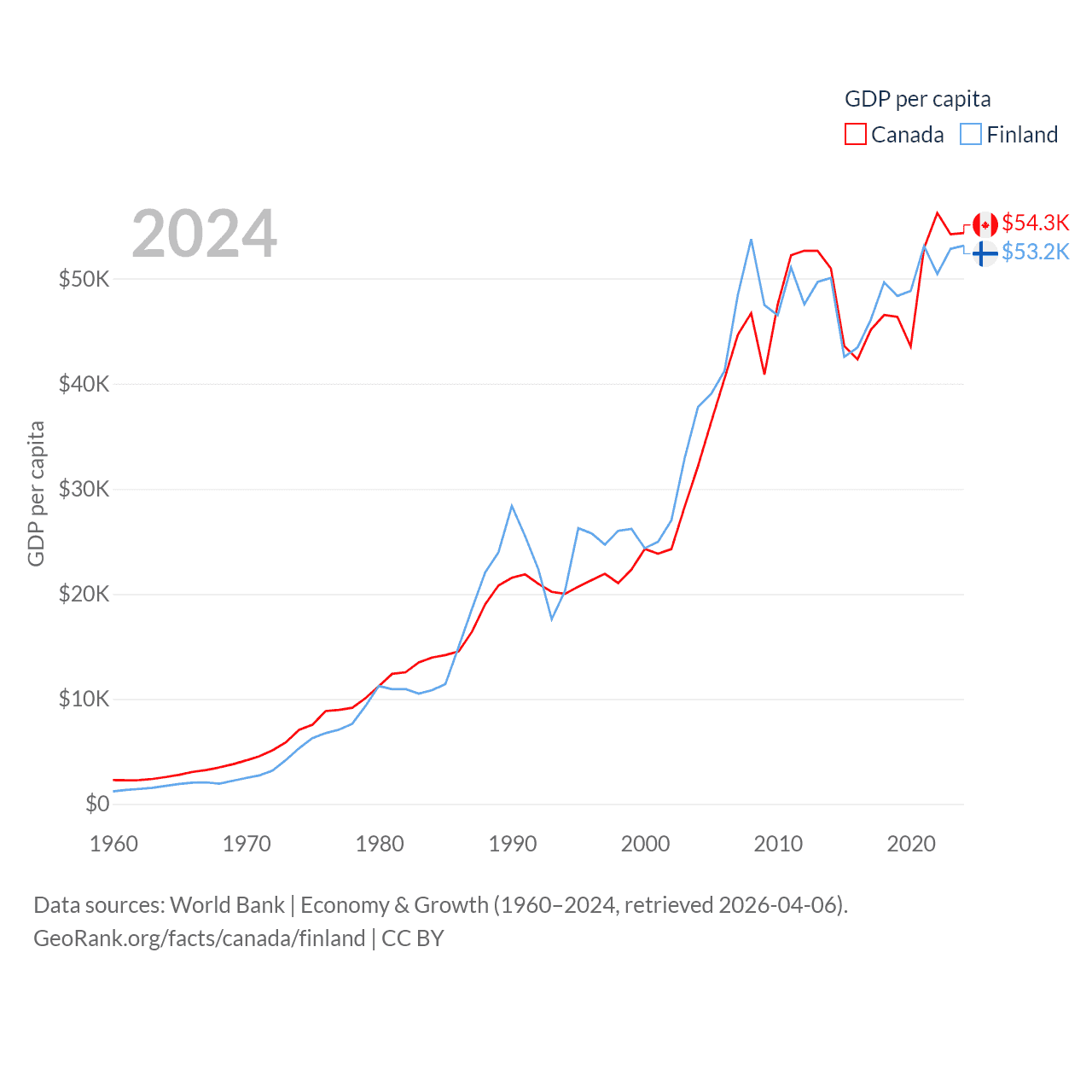 By GDP, Canada ranks 9/197 ($2.24T) and Finland ranks 47/197 ($299B). By GDP per capita, Canada ranks 20/197 ($54,340), while Finland ranks 23/197 ($53,150).