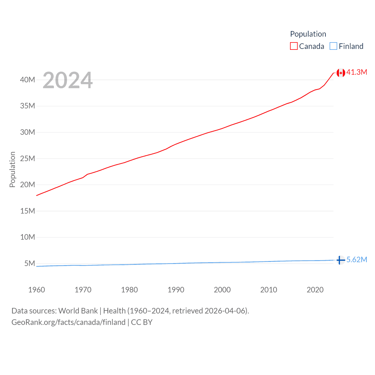 Canada has a population of 41.3M (ranked 37/197), compared with 5.62M in Finland (ranked 116/197). Canada's land area is 3,393,336 sq mi versus 117,360 sq mi for Finland (ranked 4th vs. 70th).
