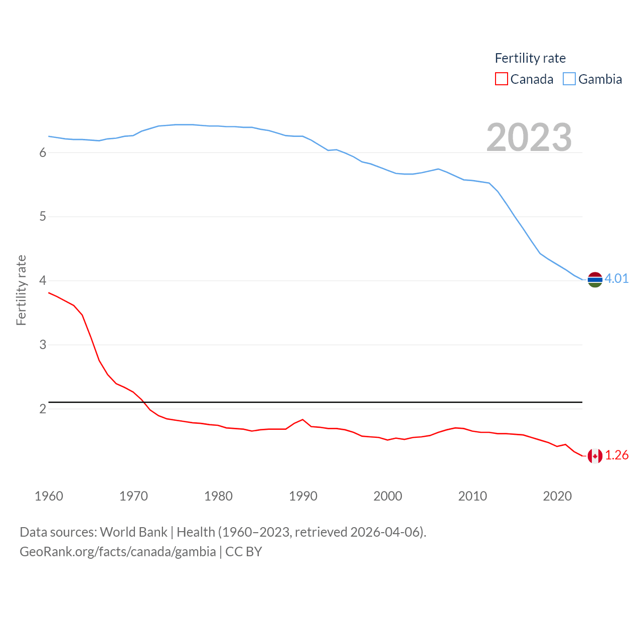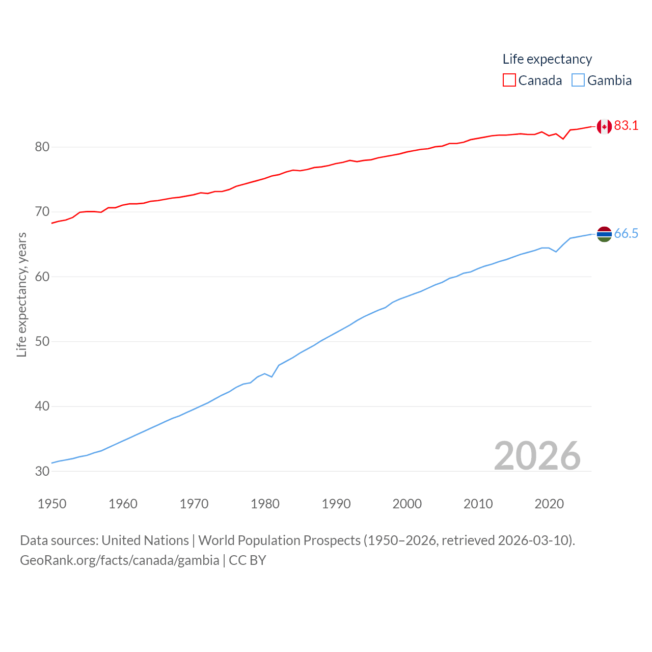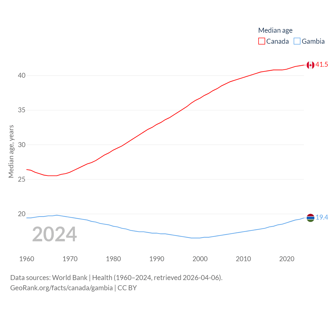Canada has a population of 41.3M (ranked 37/197), compared with 2.76M in The Gambia (ranked 140/197). Canada's land area is 3,393,336 sq mi versus 3,907 sq mi for The Gambia (ranked 4th vs. 161st).