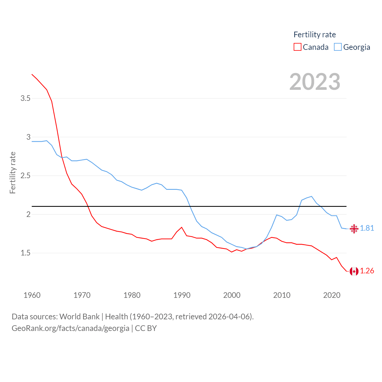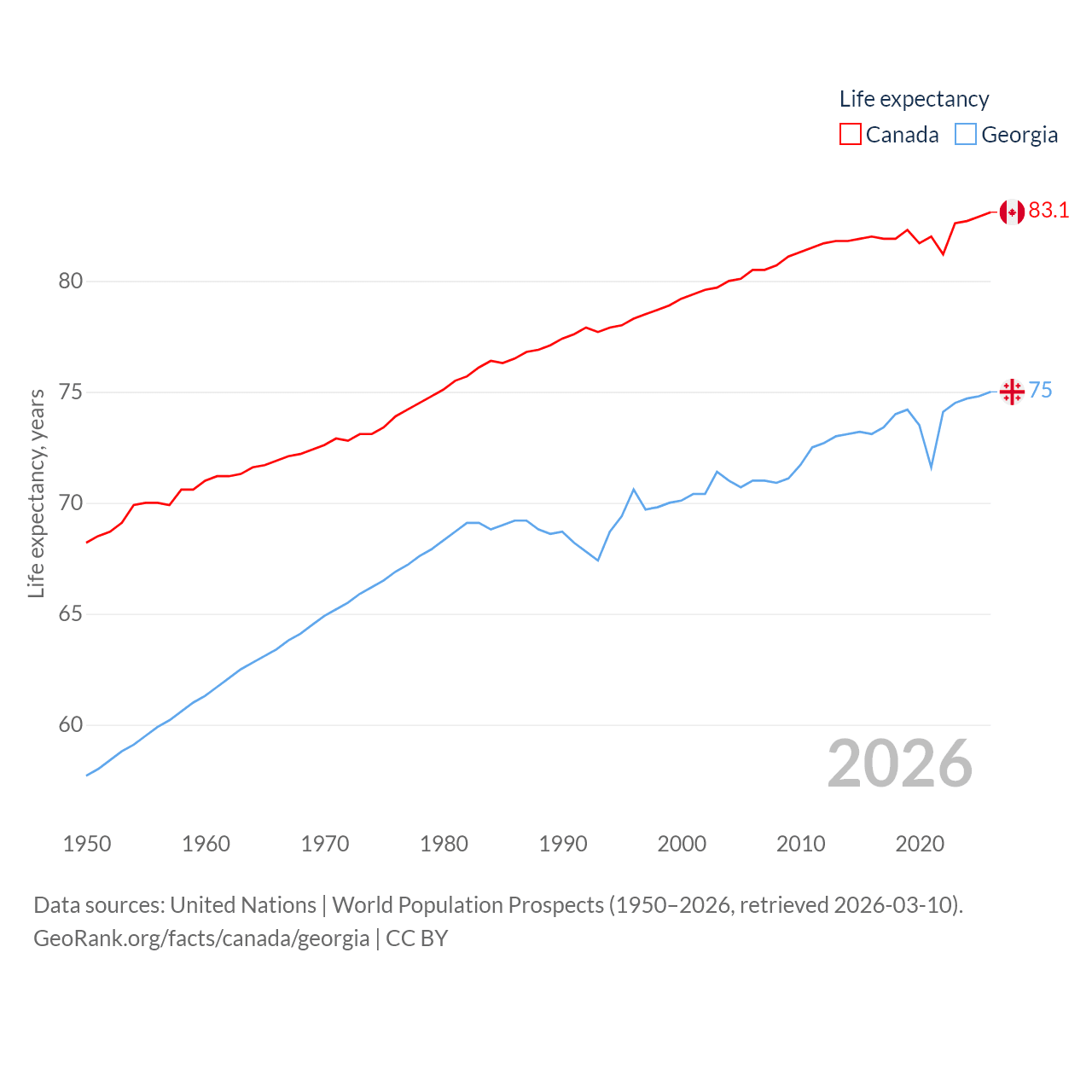 Canada has a population of 41.3M (ranked 37/197), compared with 3.7M in Georgia (ranked 130/197). Canada's land area is 3,393,336 sq mi versus 26,830 sq mi for Georgia (ranked 4th vs. 118th).