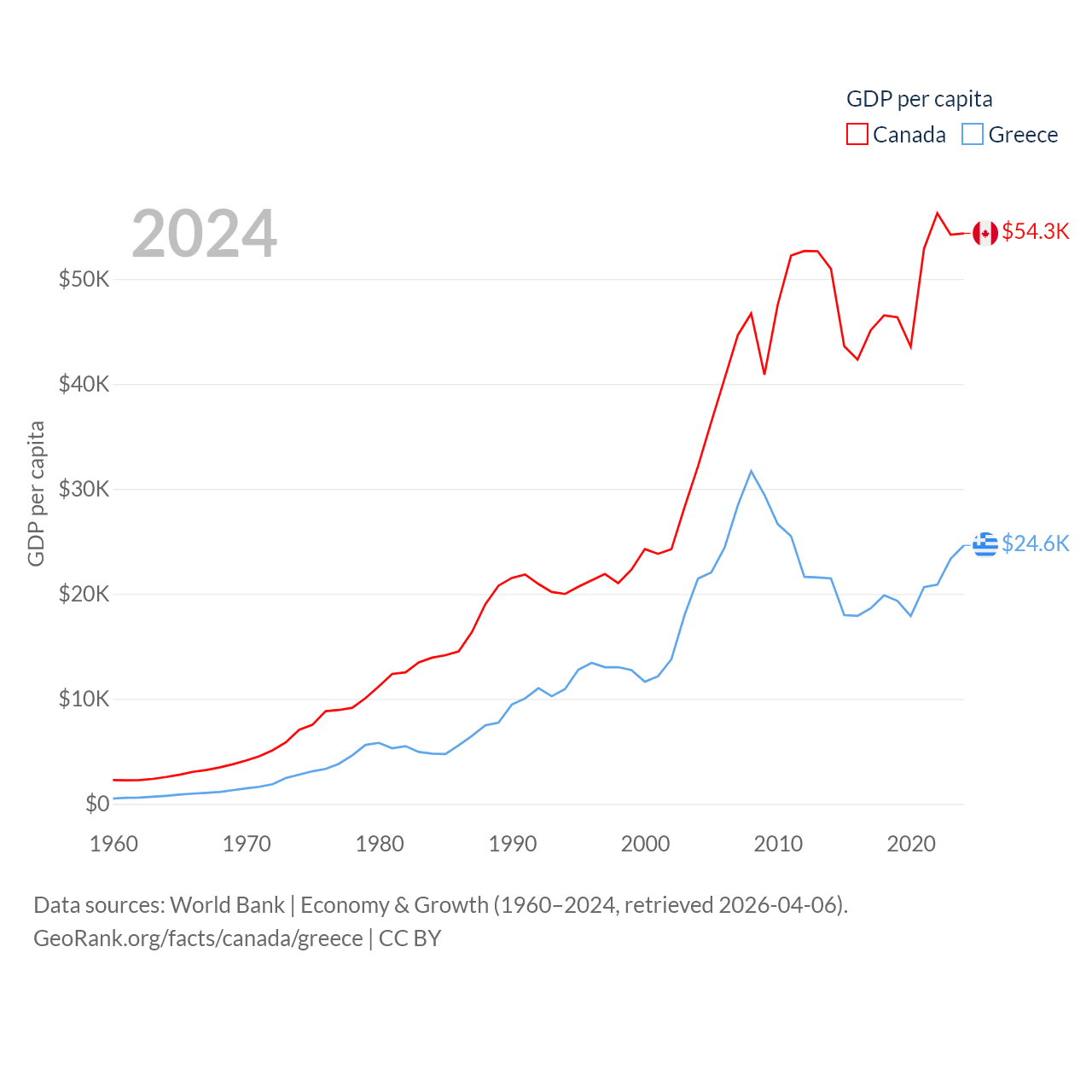 By GDP, Canada ranks 9/197 ($2.24T) and Greece ranks 53/197 ($256B). By GDP per capita, Canada ranks 20/197 ($54,340), while Greece ranks 49/197 ($24,626).