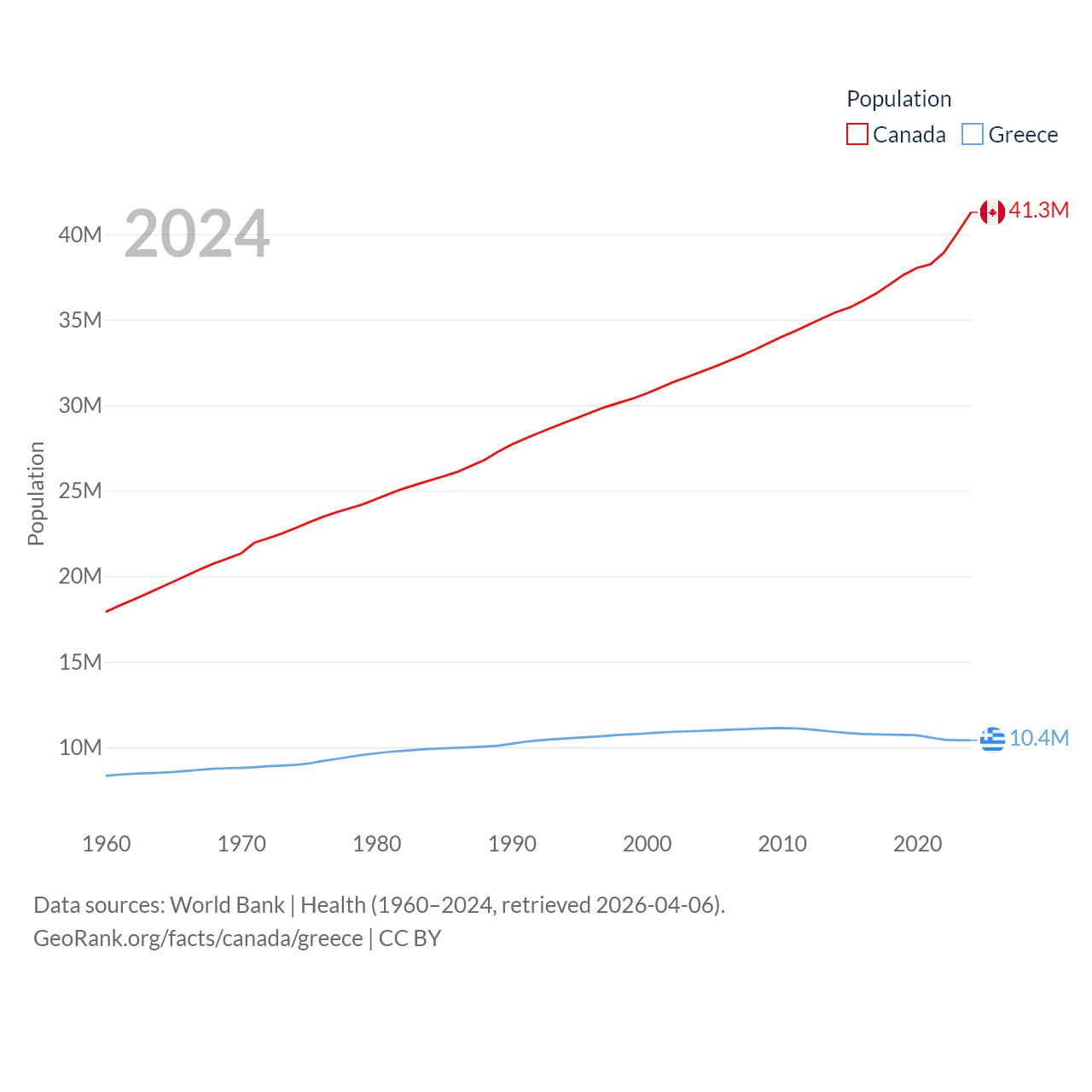 Canada has a population of 41.3M (ranked 37/197), compared with 10.4M in Greece (ranked 94/197). Canada's land area is 3,393,336 sq mi versus 49,769 sq mi for Greece (ranked 4th vs. 95th).