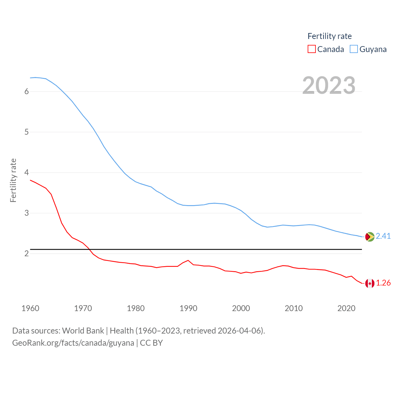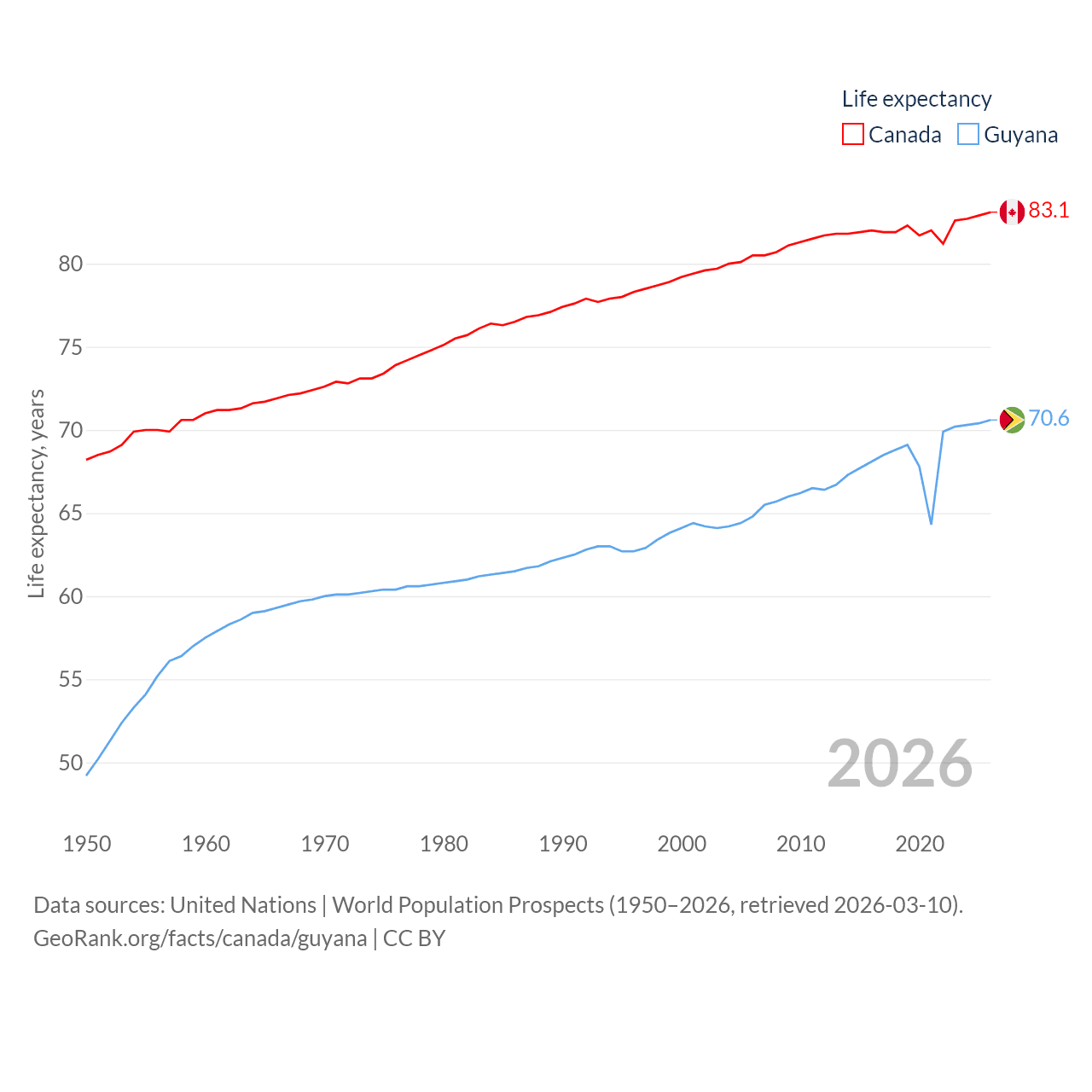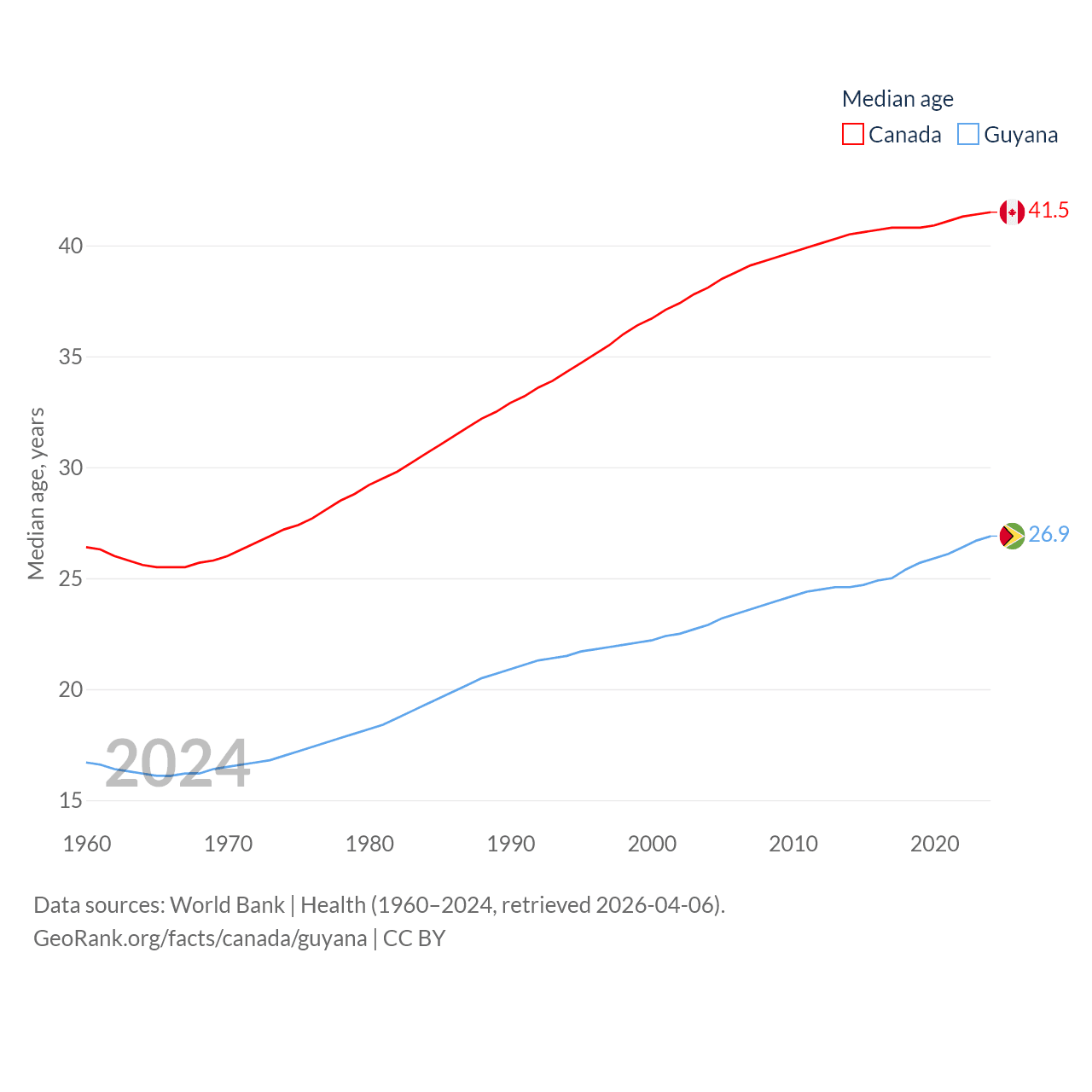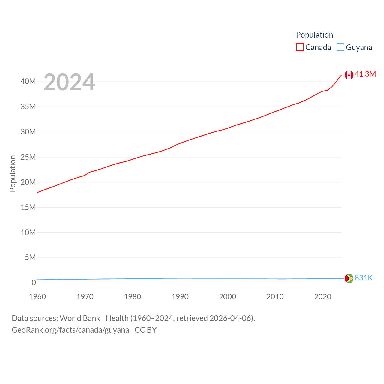 Canada has a population of 41.3M (ranked 37/197), compared with 831K in Guyana (ranked 161/197). Canada's land area is 3,393,336 sq mi versus 81,522 sq mi for Guyana (ranked 4th vs. 82nd).