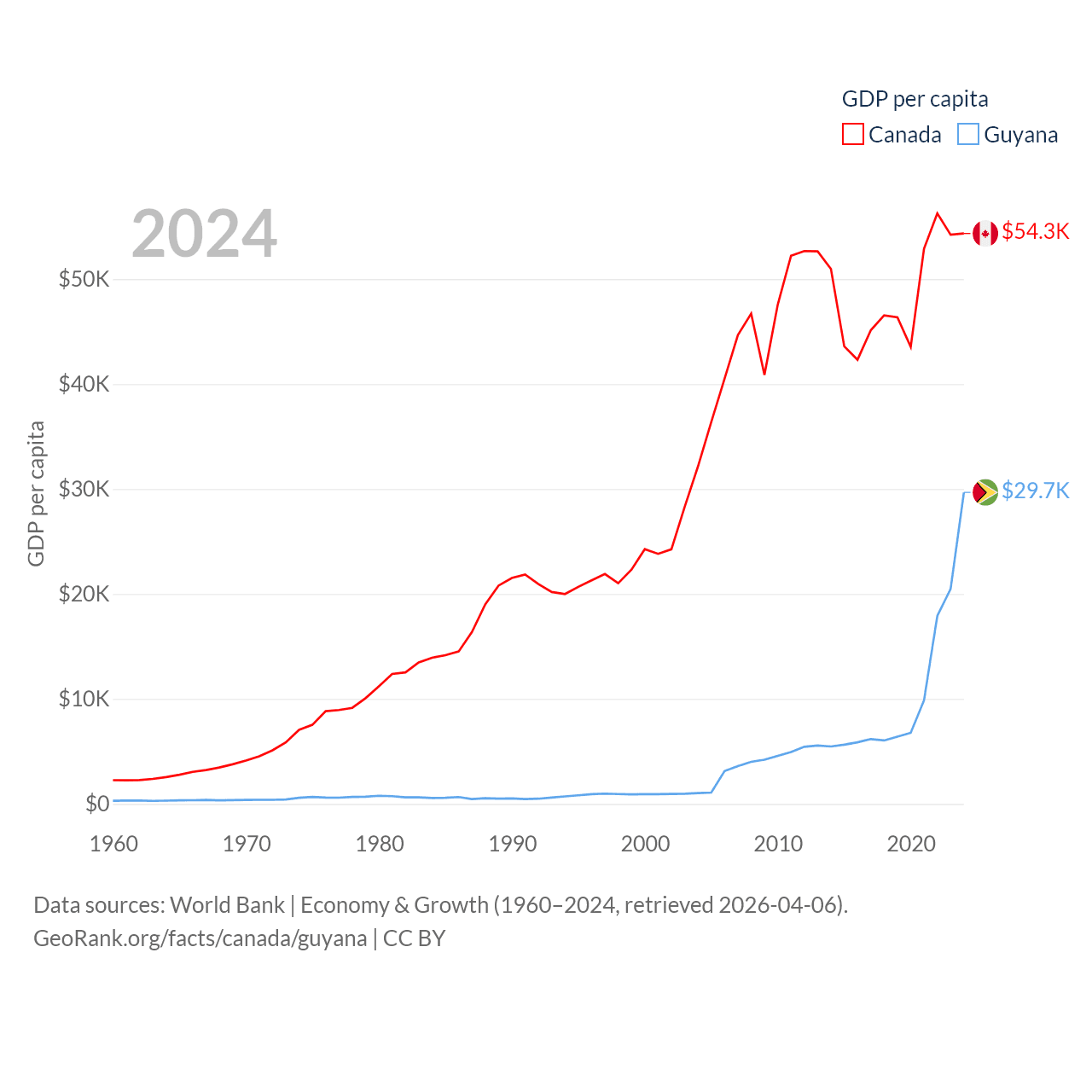 By GDP, Canada ranks 9/197 ($2.24T) and Guyana ranks 120/197 ($24.7B). By GDP per capita, Canada ranks 20/197 ($54,340), while Guyana ranks 41/197 ($29,675).