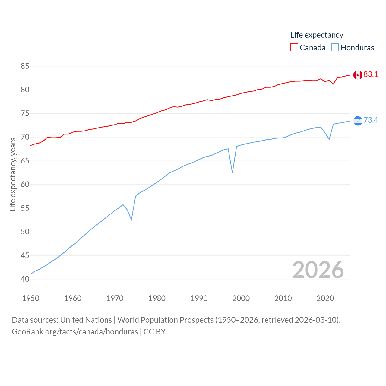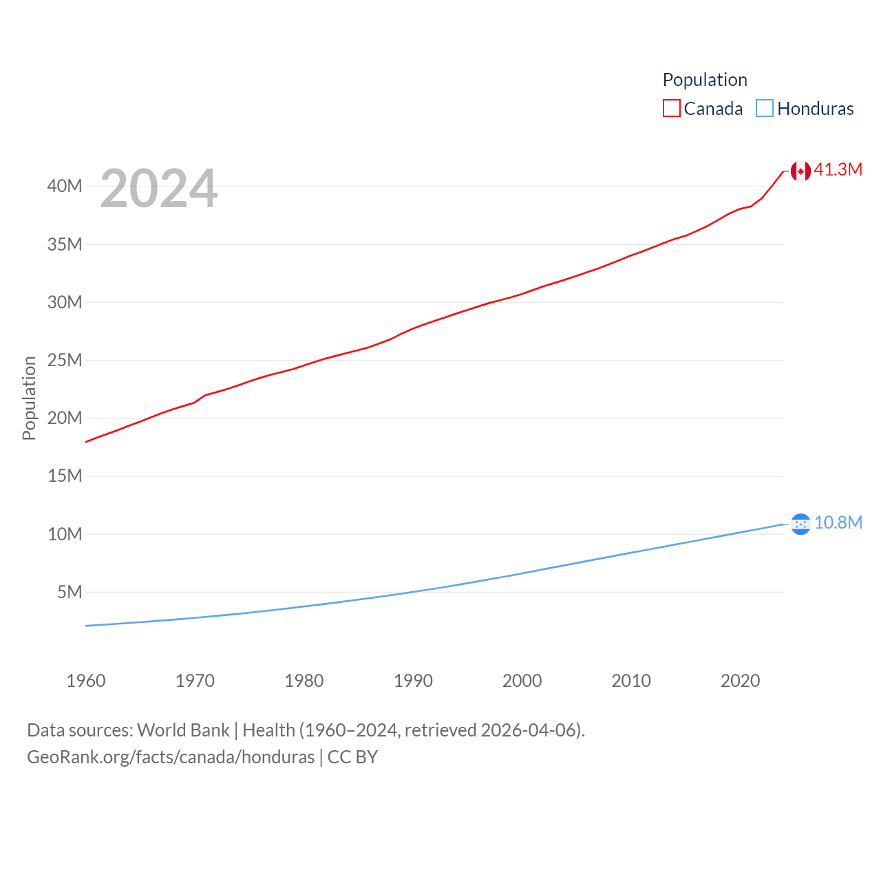 Canada has a population of 41.3M (ranked 37/197), compared with 10.8M in Honduras (ranked 89/197). Canada's land area is 3,393,336 sq mi versus 43,201 sq mi for Honduras (ranked 4th vs. 100th).