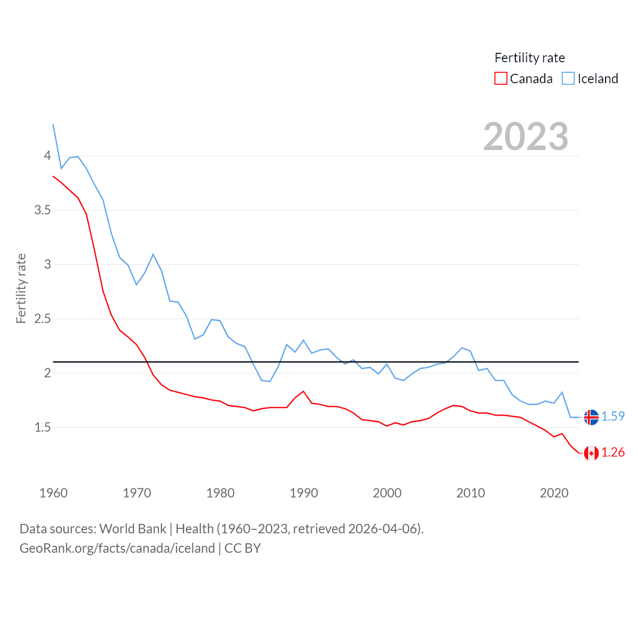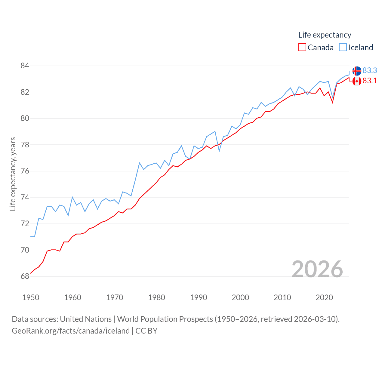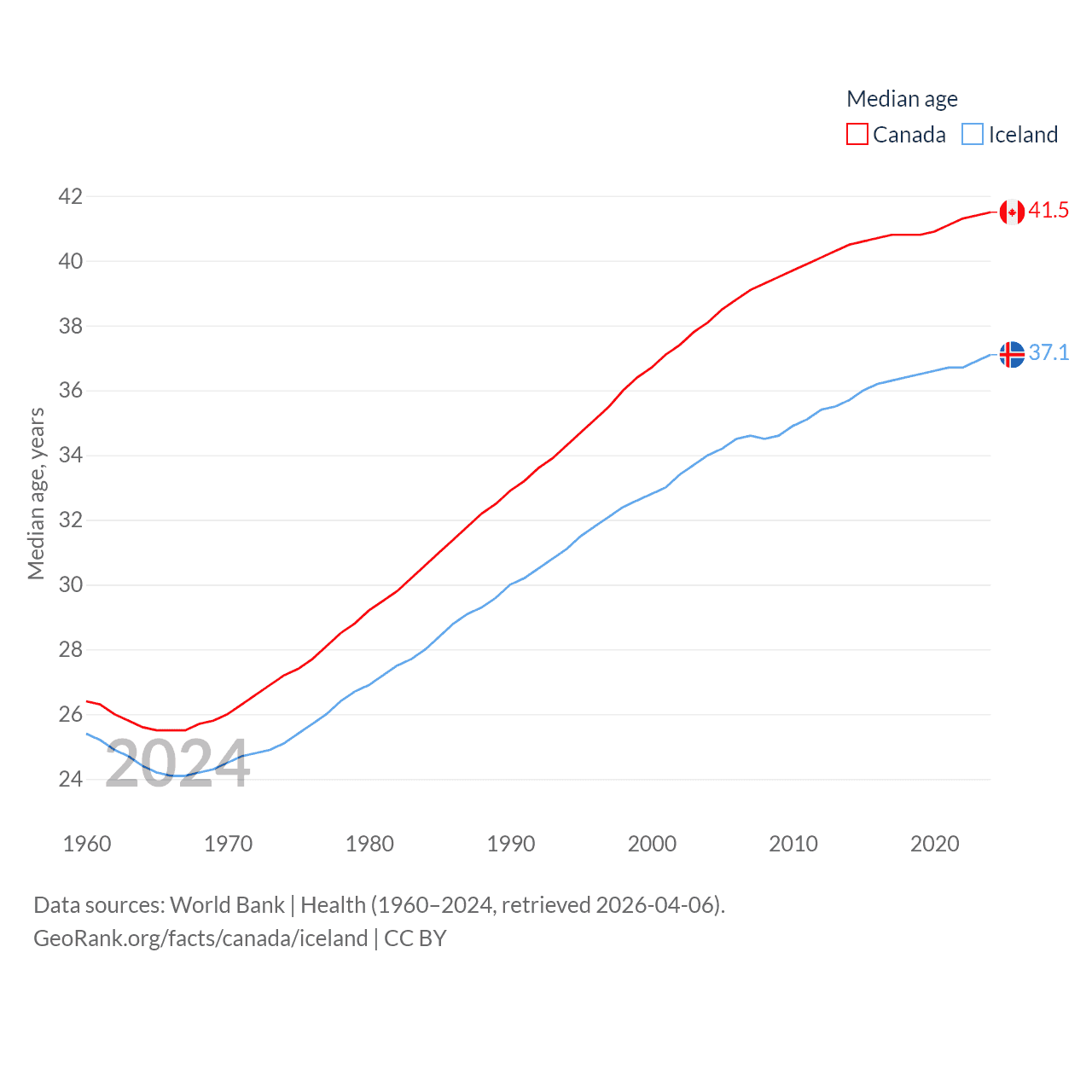 Canada has a population of 41.3M (ranked 37/197), compared with 387K in Iceland (ranked 173/197). Canada's land area is 3,393,336 sq mi versus 38,931 sq mi for Iceland (ranked 4th vs. 104th).