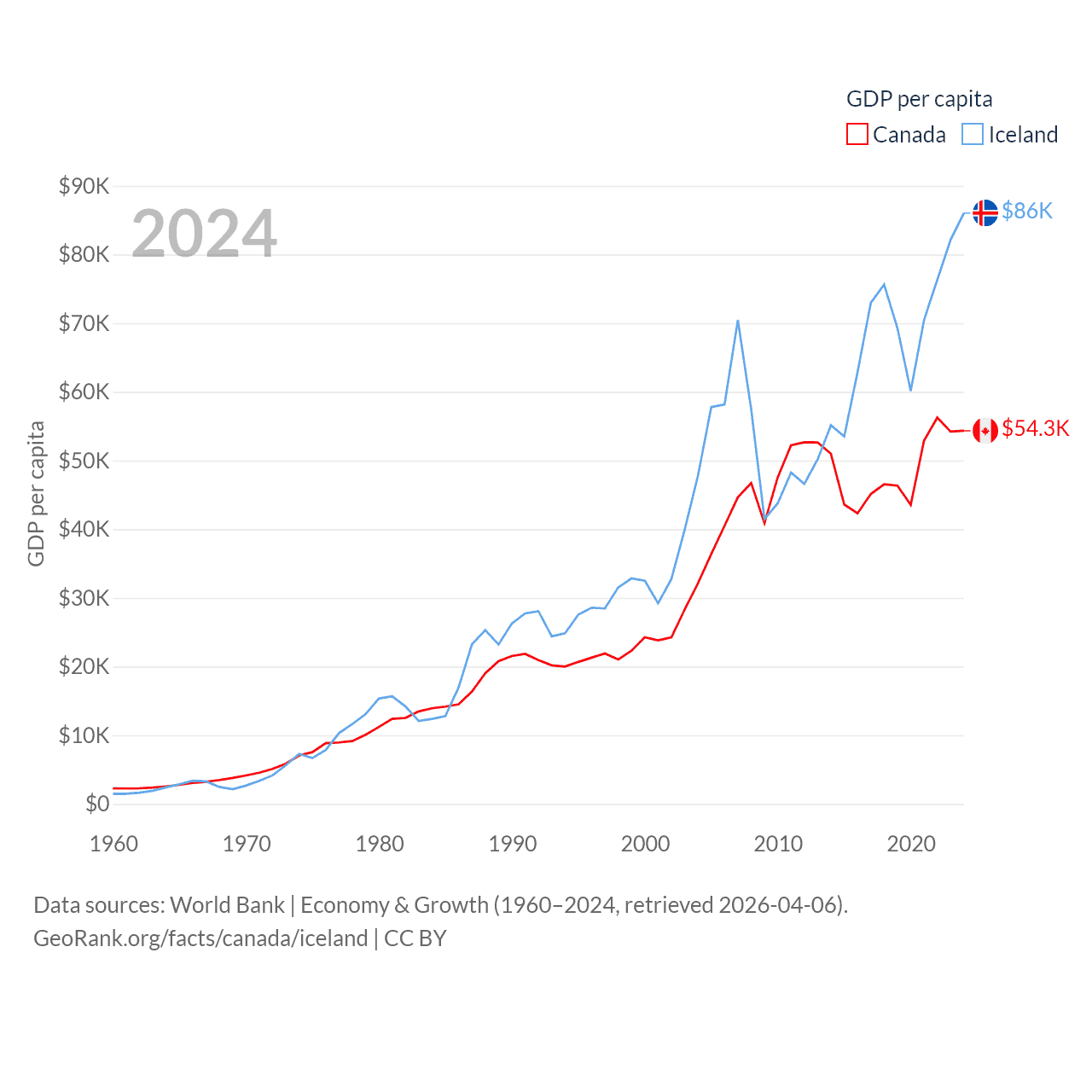 By GDP, Canada ranks 9/197 ($2.24T) and Iceland ranks 108/197 ($33.3B). By GDP per capita, Canada ranks 20/197 ($54,340), while Iceland ranks 9/197 ($86,041).