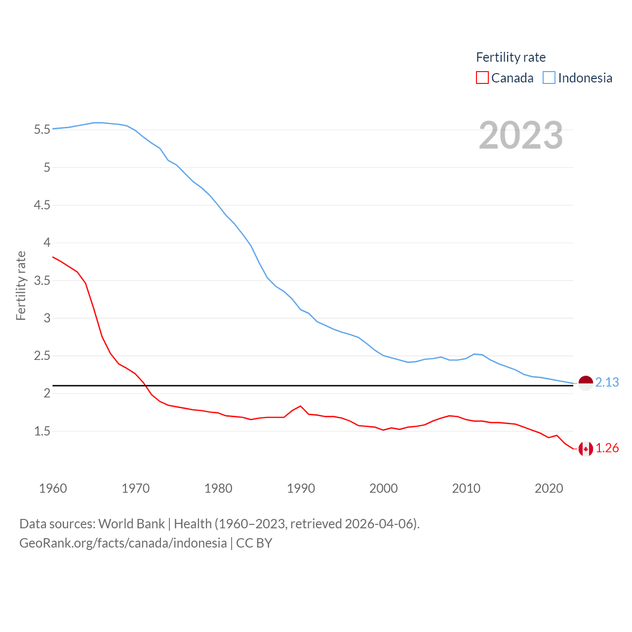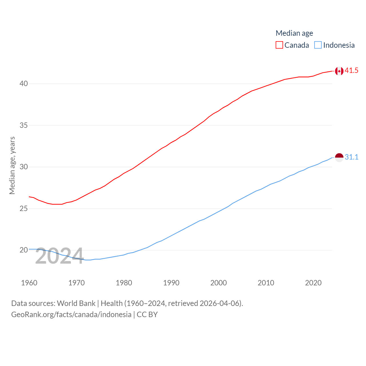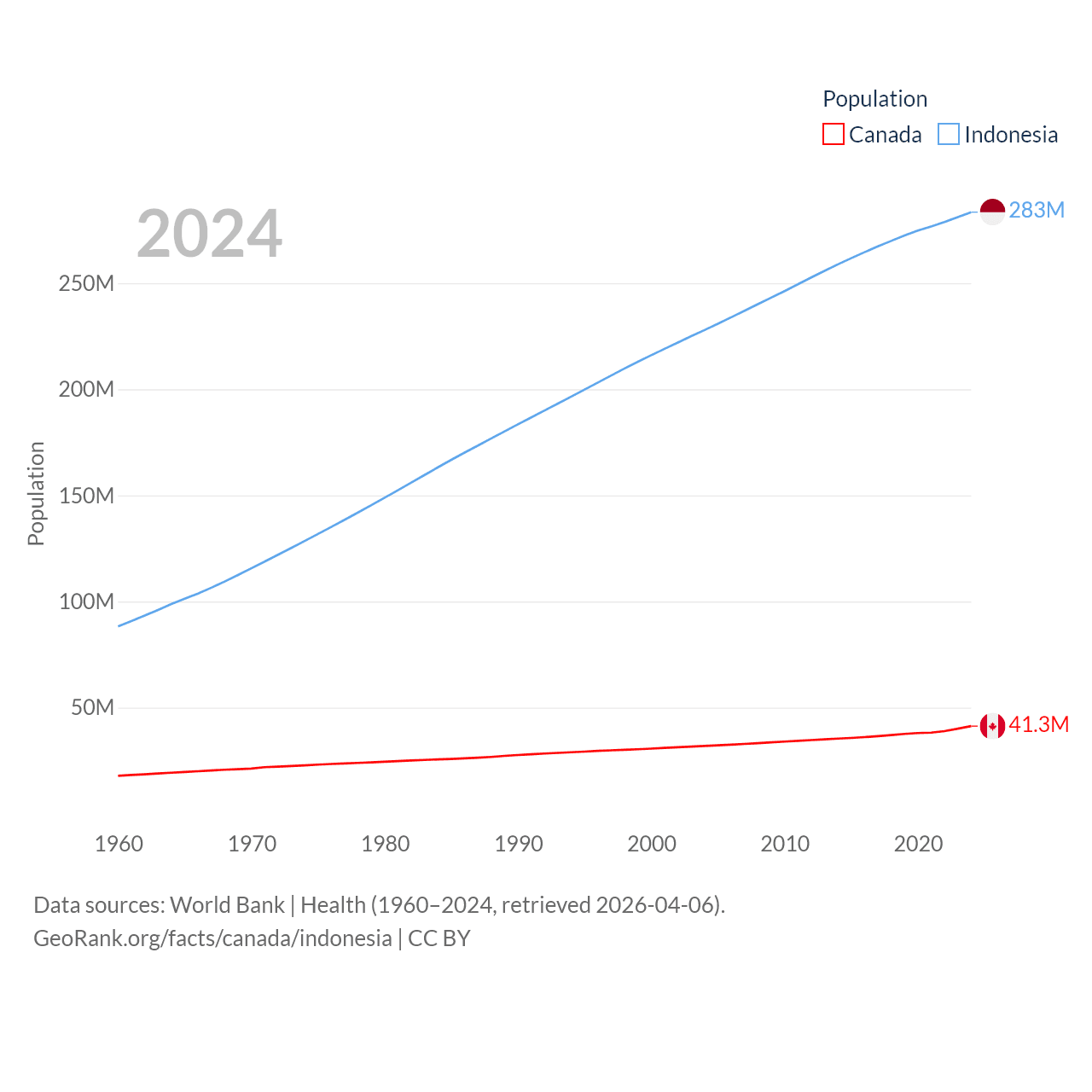 Canada has a population of 41.3M (ranked 37/197), compared with 283M in Indonesia (ranked 4/197). Canada's land area is 3,393,336 sq mi versus 730,720 sq mi for Indonesia (ranked 4th vs. 14th).