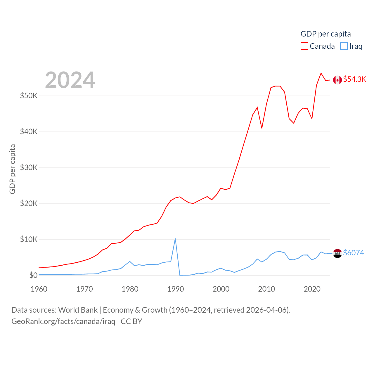 By GDP, Canada ranks 9/197 ($2.24T) and Iraq ranks 50/197 ($280B). By GDP per capita, Canada ranks 20/197 ($54,340), while Iraq ranks 113/197 ($6,074).