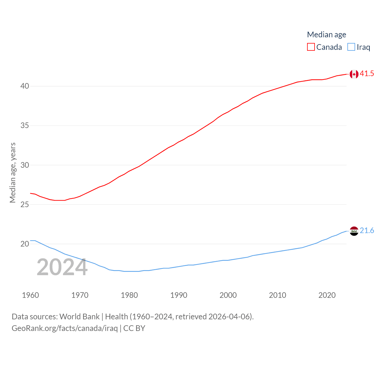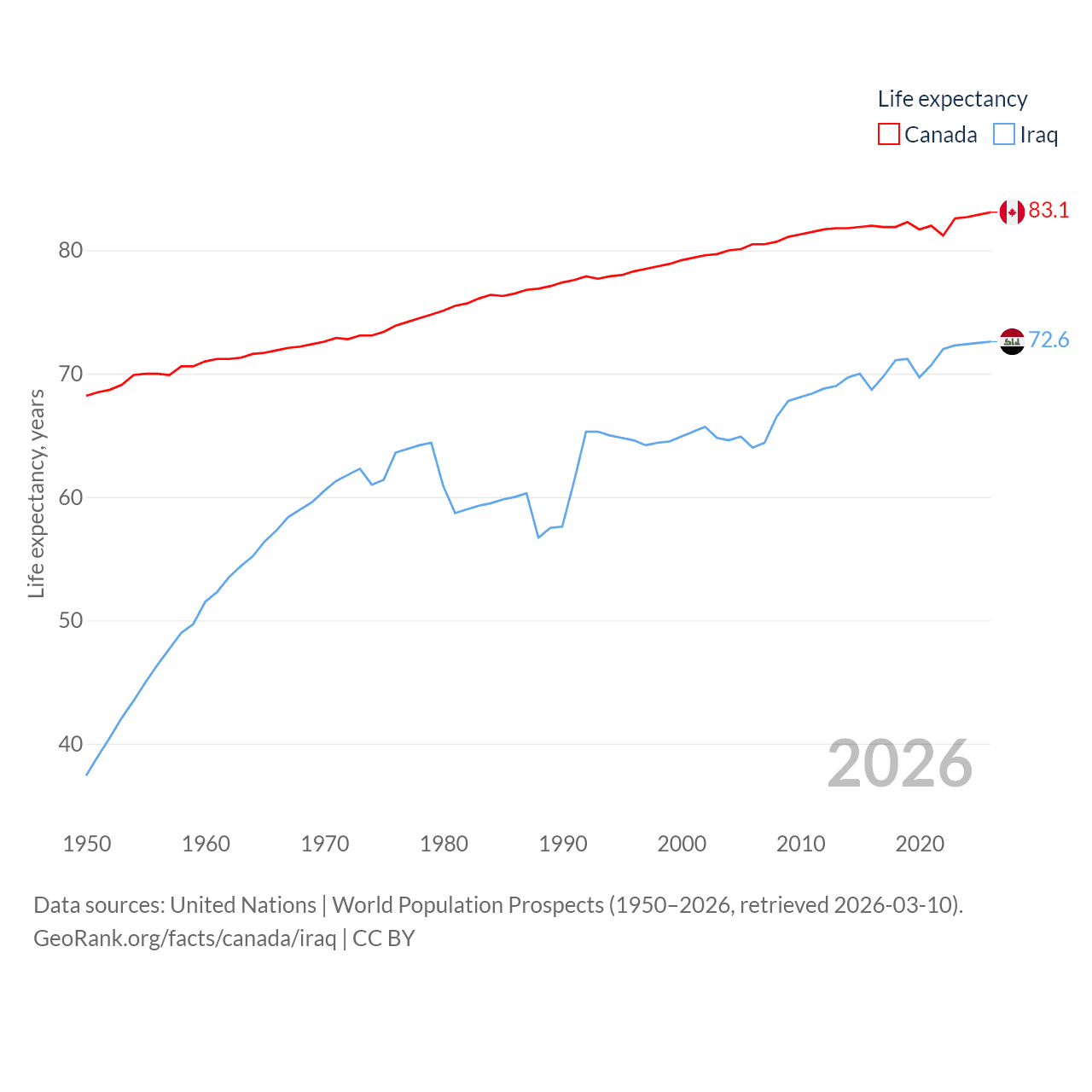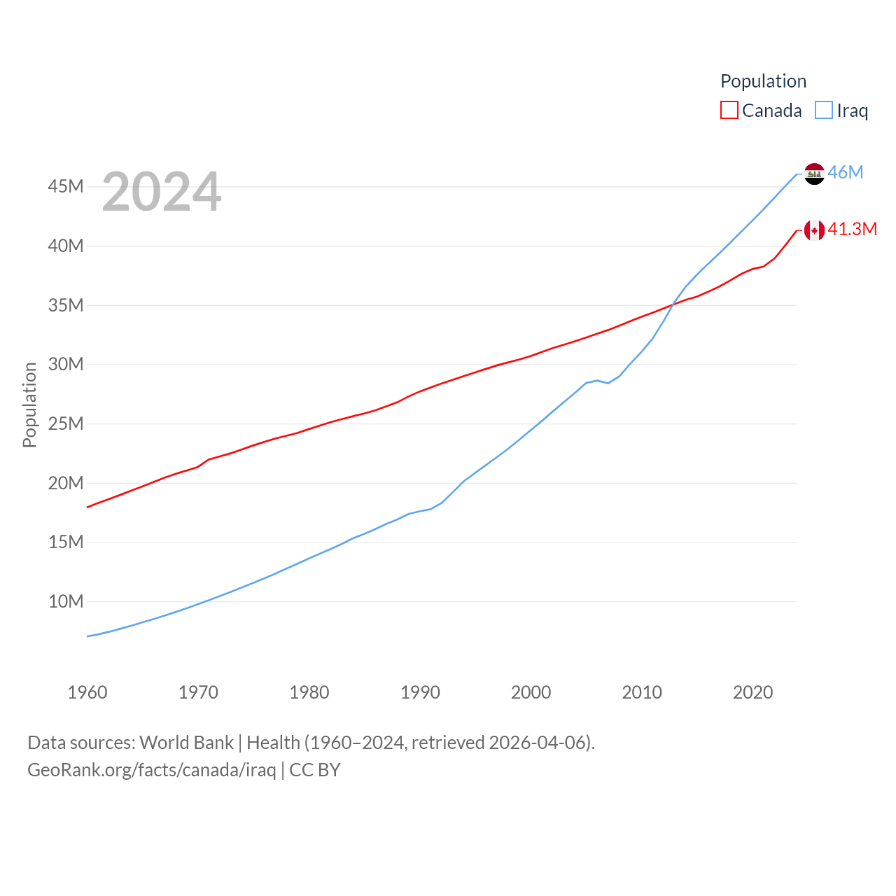 Canada has a population of 41.3M (ranked 37/197), compared with 46M in Iraq (ranked 34/197). Canada's land area is 3,393,336 sq mi versus 167,619 sq mi for Iraq (ranked 4th vs. 57th).