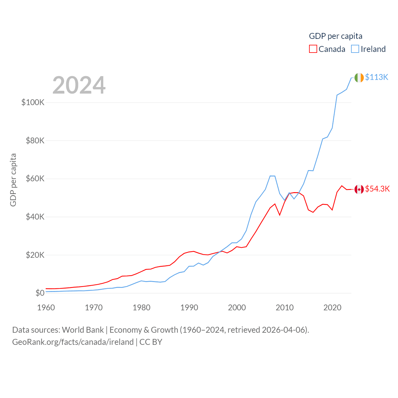 By GDP, Canada ranks 9/197 ($2.24T) and Ireland ranks 25/197 ($609B). By GDP per capita, Canada ranks 20/197 ($54,340), while Ireland ranks 4/197 ($112,895).