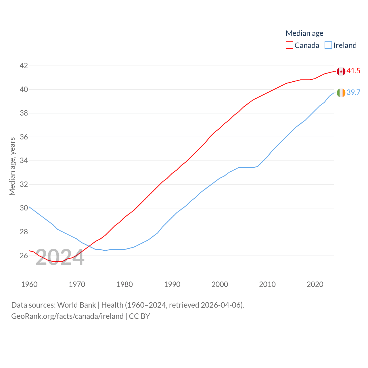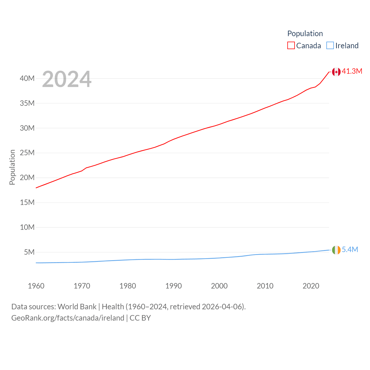 Canada has a population of 41.3M (ranked 37/197), compared with 5.4M in Ireland (ranked 120/197). Canada's land area is 3,393,336 sq mi versus 26,599 sq mi for Ireland (ranked 4th vs. 119th).