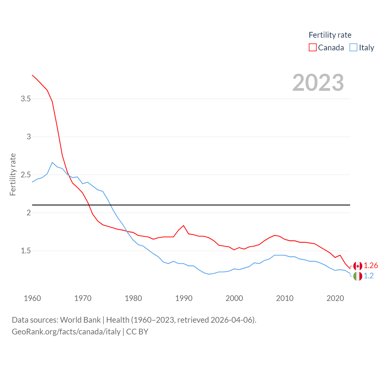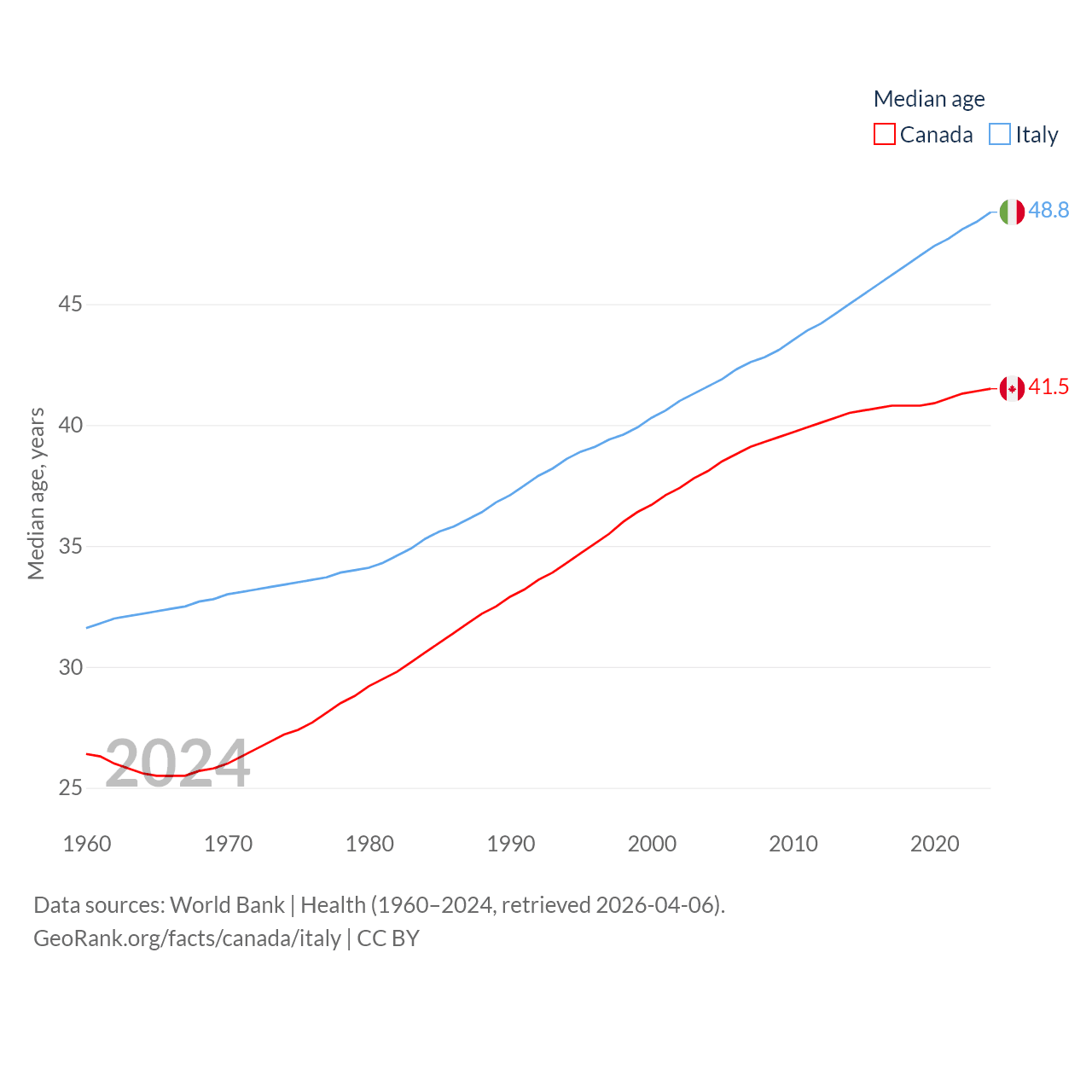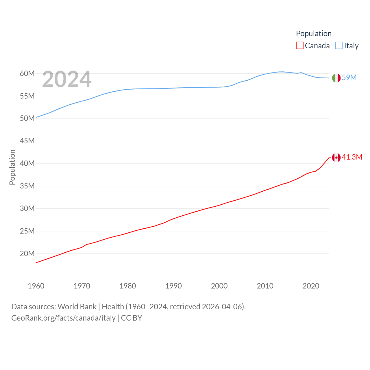 Canada has a population of 41.3M (ranked 37/197), compared with 59M in Italy (ranked 25/197). Canada's land area is 3,393,336 sq mi versus 114,178 sq mi for Italy (ranked 4th vs. 72nd).