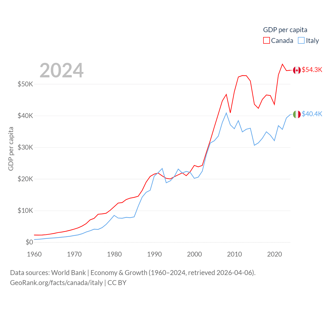 By GDP, Canada ranks 9/197 ($2.24T) and Italy ranks 8/197 ($2.38T). By GDP per capita, Canada ranks 20/197 ($54,340), while Italy ranks 29/197 ($40,385).