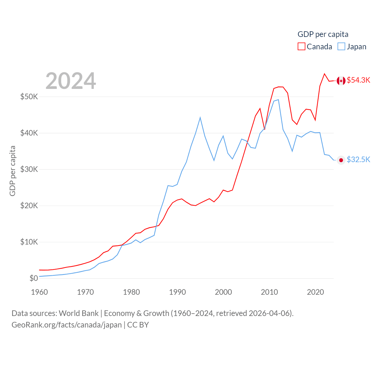 By GDP, Canada ranks 9/197 ($2.24T) and Japan ranks 4/197 ($4.03T). By GDP per capita, Canada ranks 20/197 ($54,340), while Japan ranks 38/197 ($32,487).