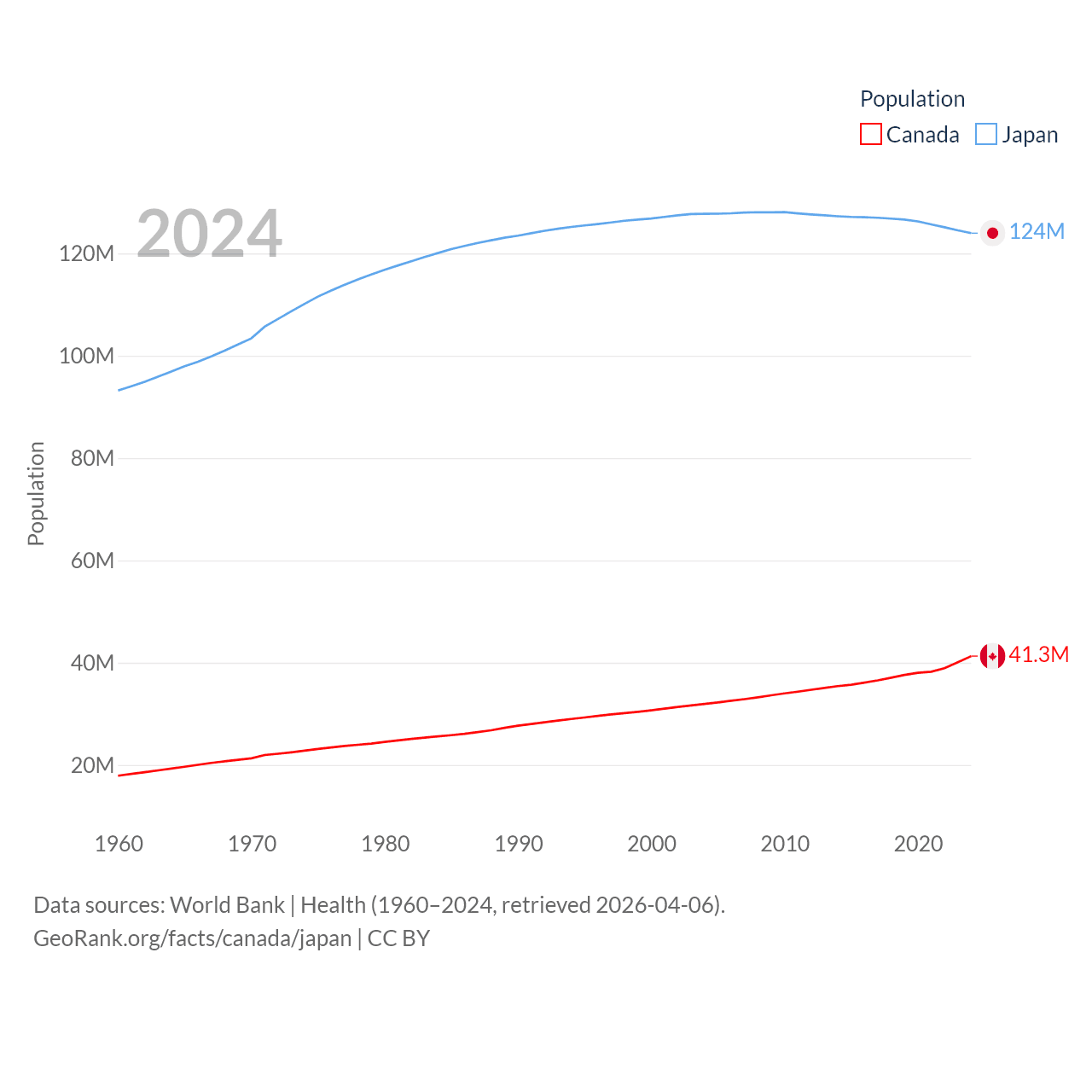 Canada has a population of 41.3M (ranked 37/197), compared with 124M in Japan (ranked 12/197). Canada's land area is 3,393,336 sq mi versus 140,761 sq mi for Japan (ranked 4th vs. 61st).