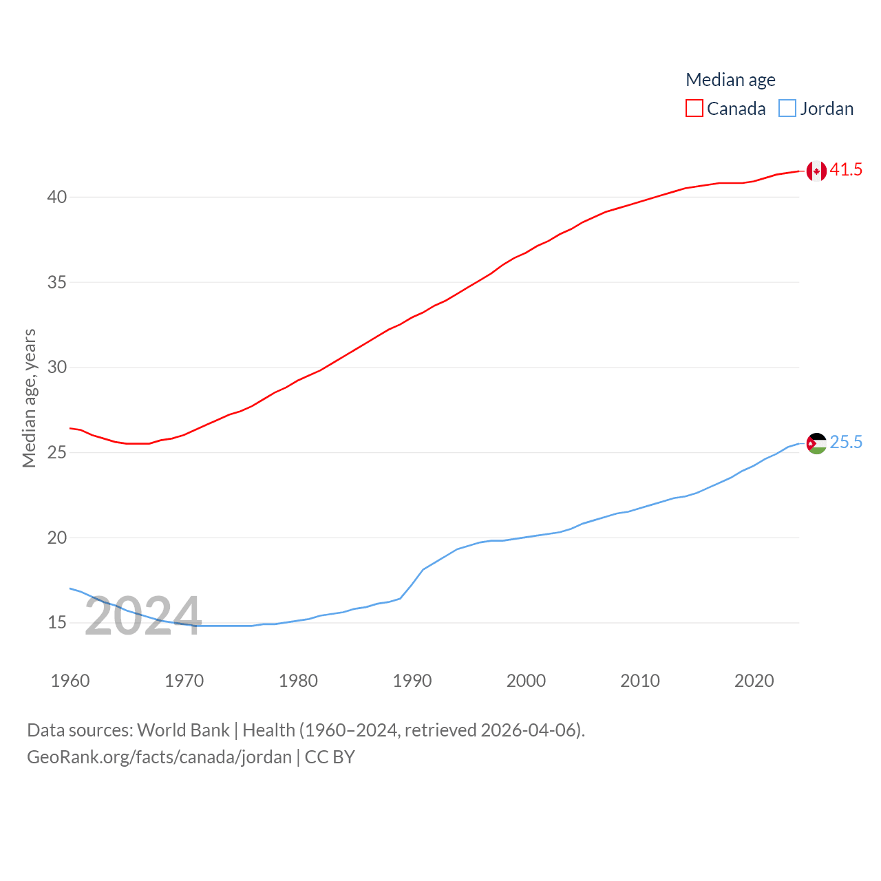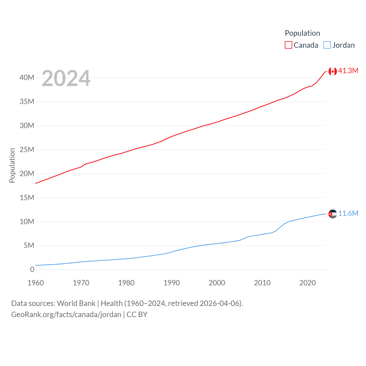 Canada has a population of 41.3M (ranked 37/197), compared with 11.6M in Jordan (ranked 84/197). Canada's land area is 3,393,336 sq mi versus 34,284 sq mi for Jordan (ranked 4th vs. 110th).