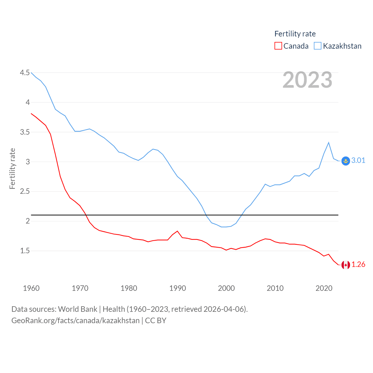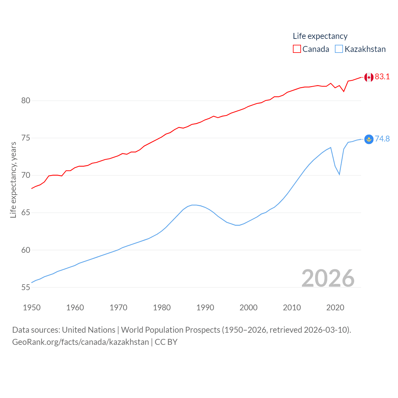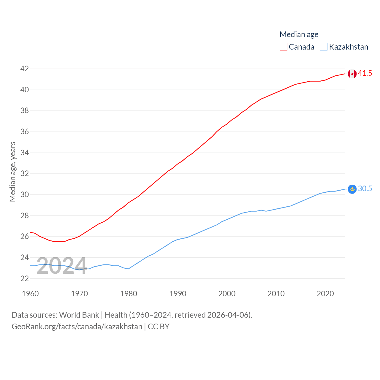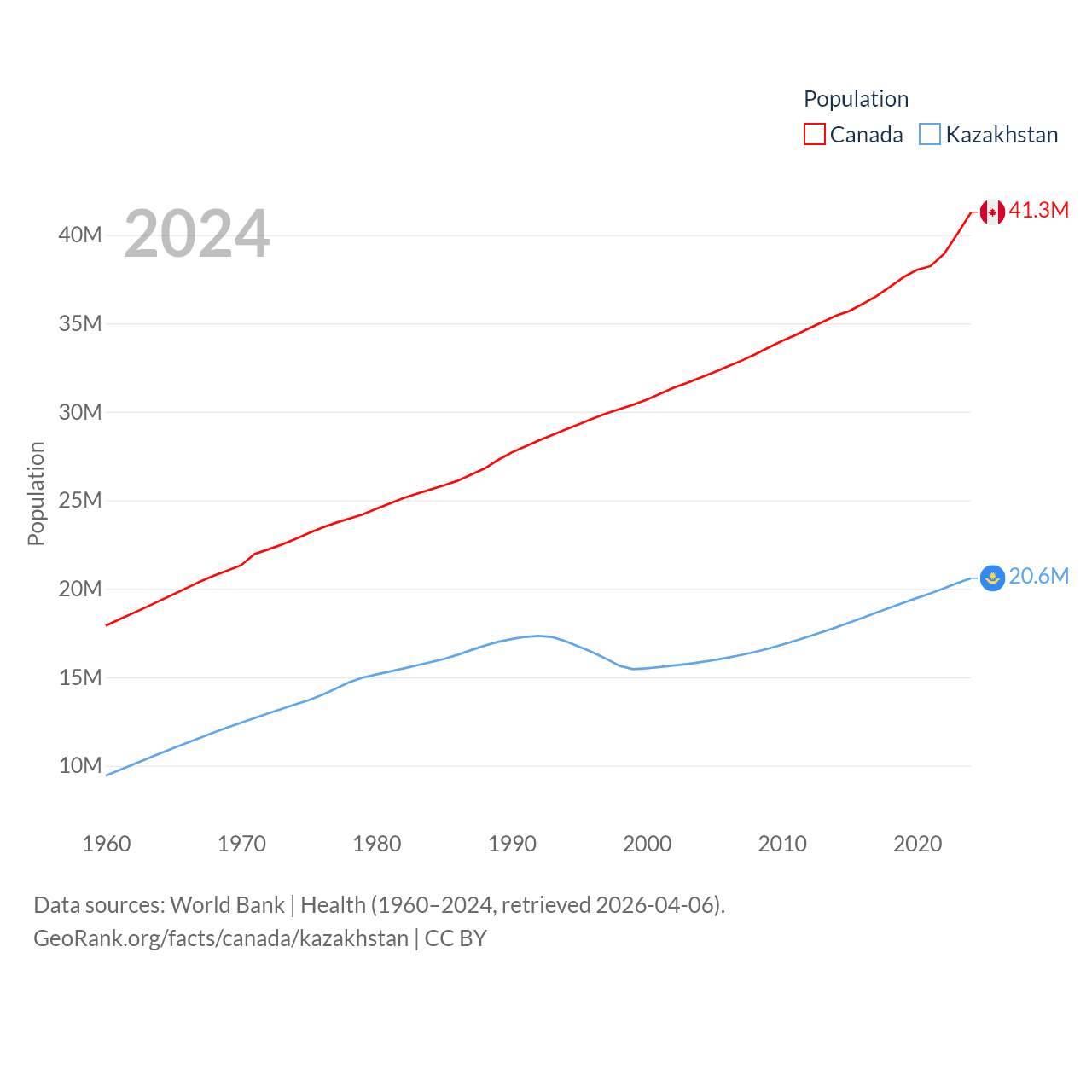Canada has a population of 41.3M (ranked 37/197), compared with 20.6M in Kazakhstan (ranked 64/197). Canada's land area is 3,393,336 sq mi versus 1,042,360 sq mi for Kazakhstan (ranked 4th vs. 9th).