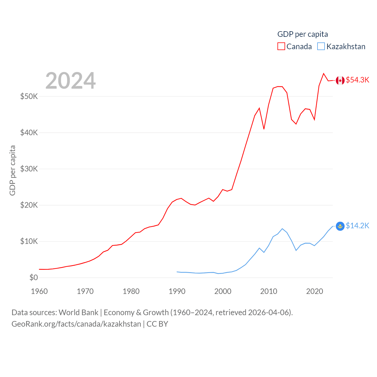 By GDP, Canada ranks 9/197 ($2.24T) and Kazakhstan ranks 48/197 ($291B). By GDP per capita, Canada ranks 20/197 ($54,340), while Kazakhstan ranks 71/197 ($14,155).