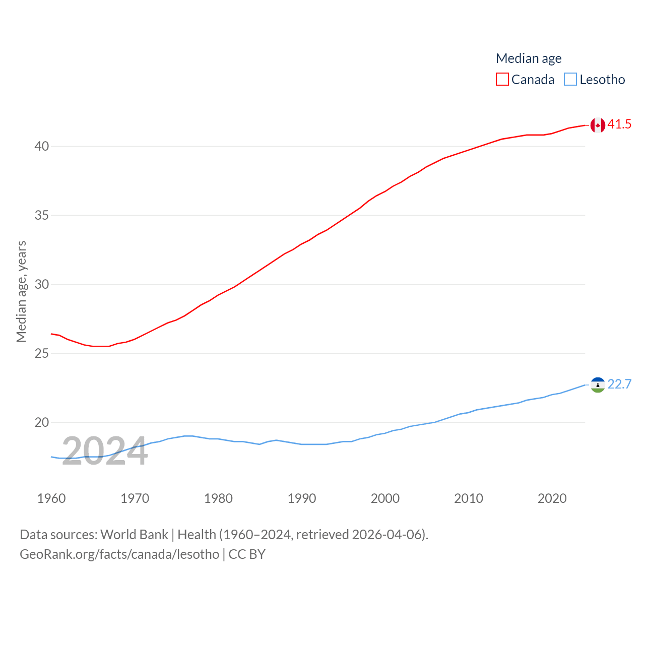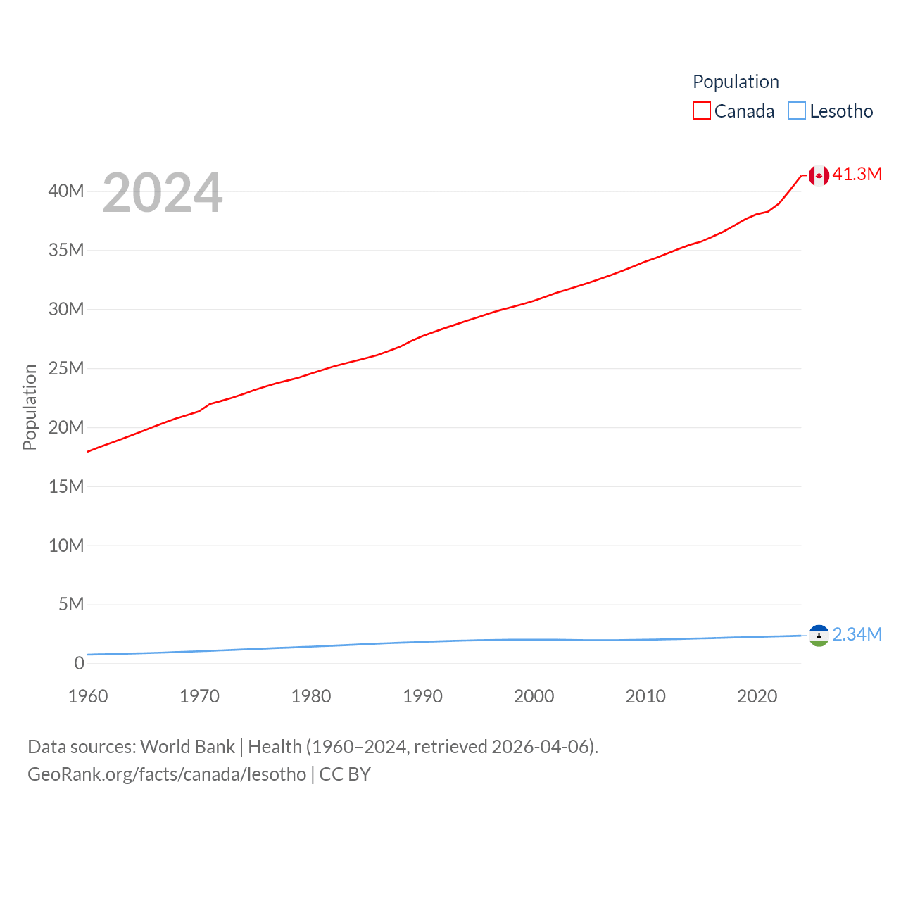 Canada has a population of 41.3M (ranked 37/197), compared with 2.34M in Lesotho (ranked 145/197). Canada's land area is 3,393,336 sq mi versus 11,722 sq mi for Lesotho (ranked 4th vs. 137th).
