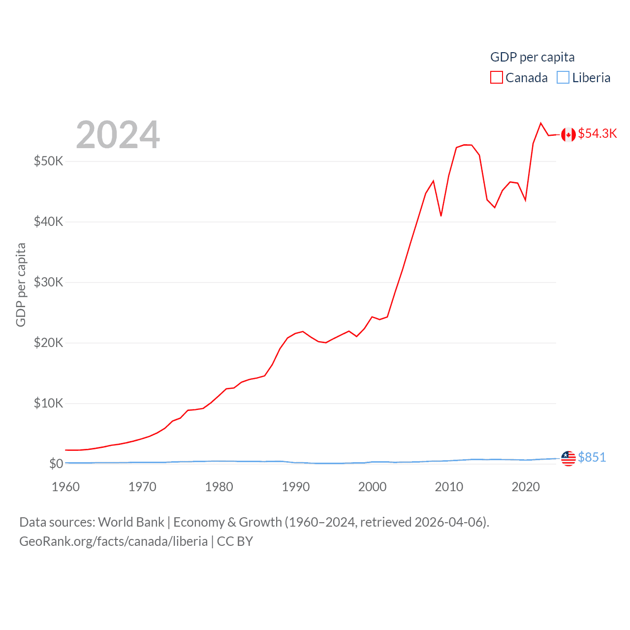 By GDP, Canada ranks 9/197 ($2.24T) and Liberia ranks 163/197 ($4.78B). By GDP per capita, Canada ranks 20/197 ($54,340), while Liberia ranks 184/197 ($851).