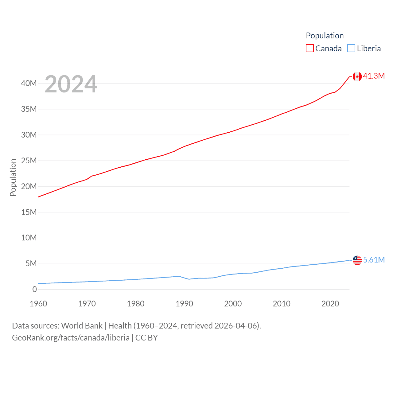 Canada has a population of 41.3M (ranked 37/197), compared with 5.61M in Liberia (ranked 117/197). Canada's land area is 3,393,336 sq mi versus 37,189 sq mi for Liberia (ranked 4th vs. 106th).