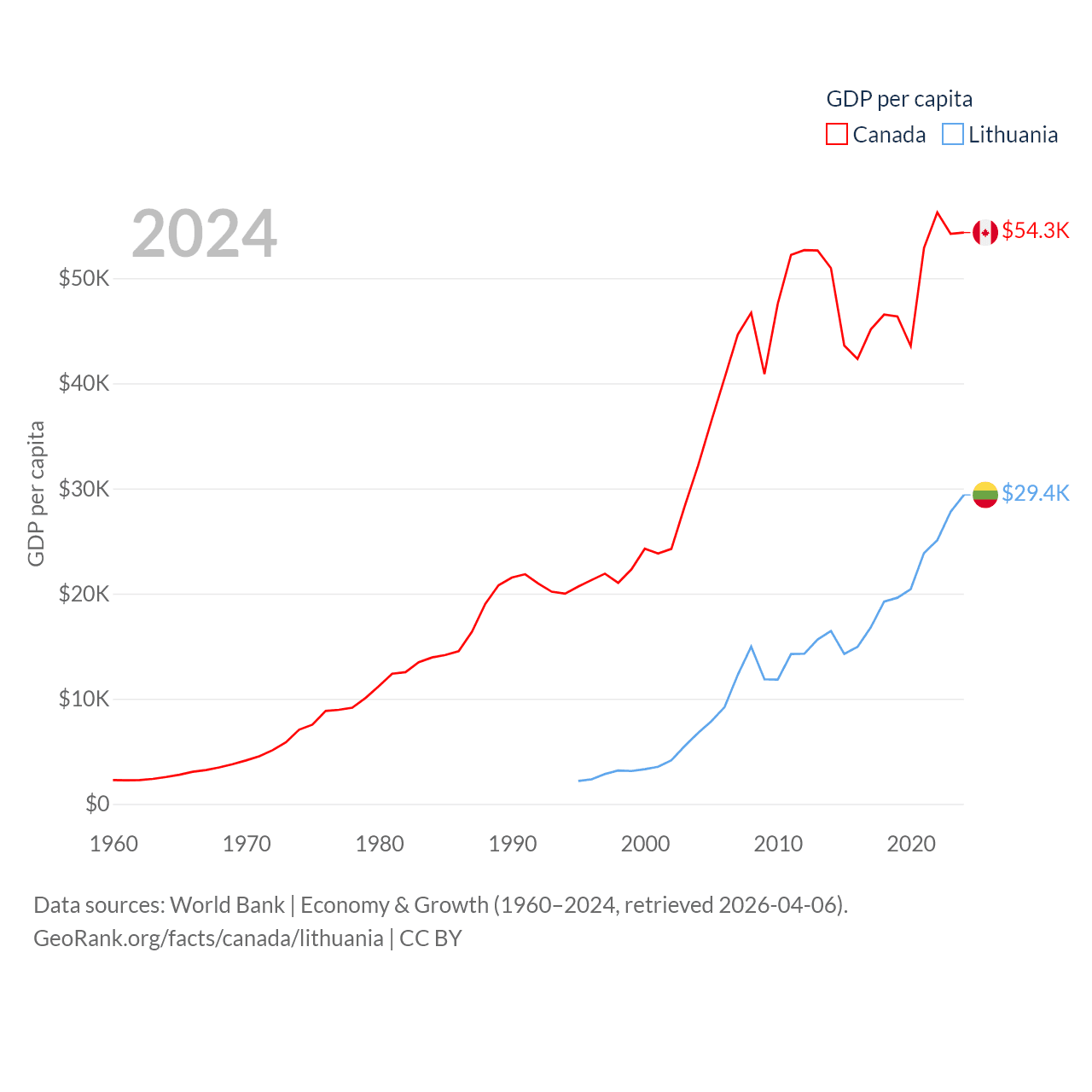 By GDP, Canada ranks 9/197 ($2.24T) and Lithuania ranks 79/197 ($84.9B). By GDP per capita, Canada ranks 20/197 ($54,340), while Lithuania ranks 43/197 ($29,384).
