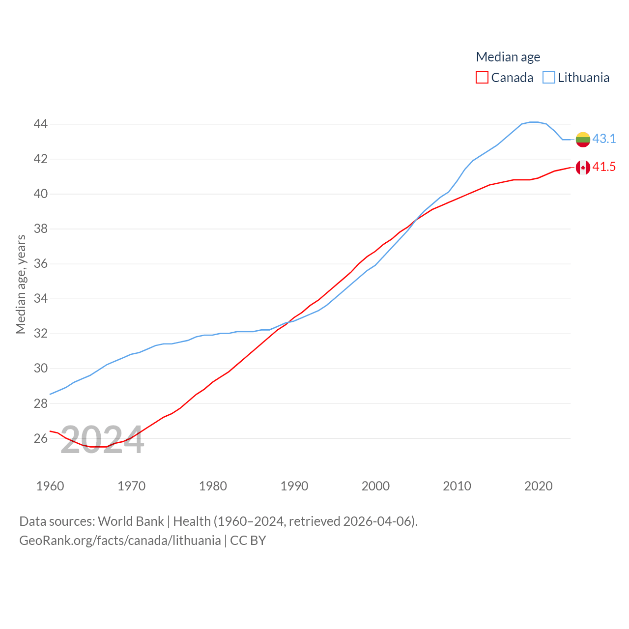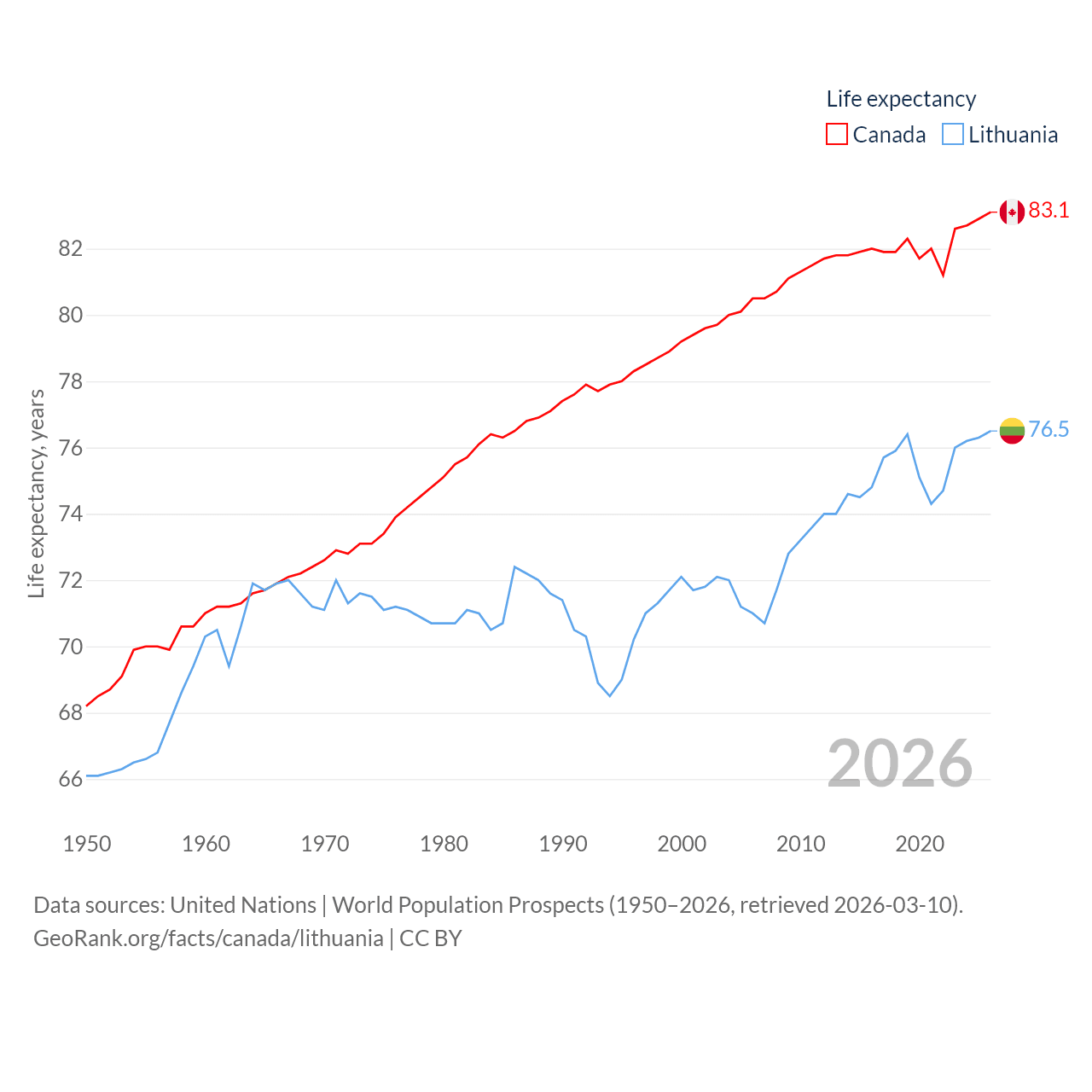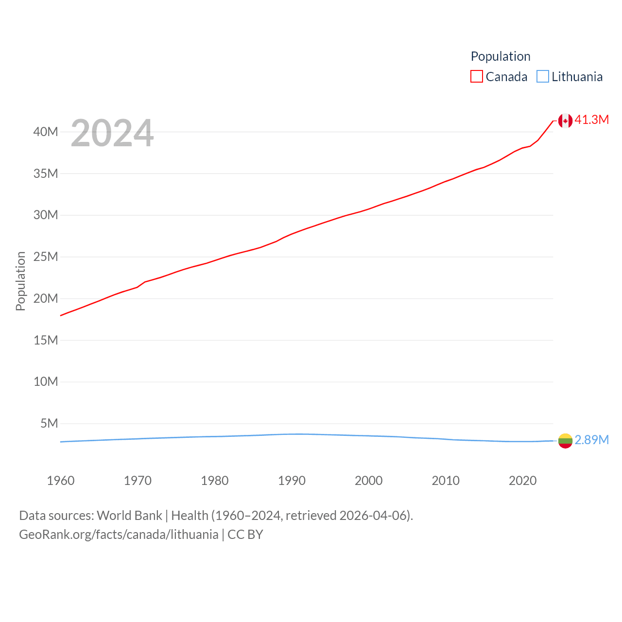 Canada has a population of 41.3M (ranked 37/197), compared with 2.89M in Lithuania (ranked 137/197). Canada's land area is 3,393,336 sq mi versus 24,170 sq mi for Lithuania (ranked 4th vs. 120th).