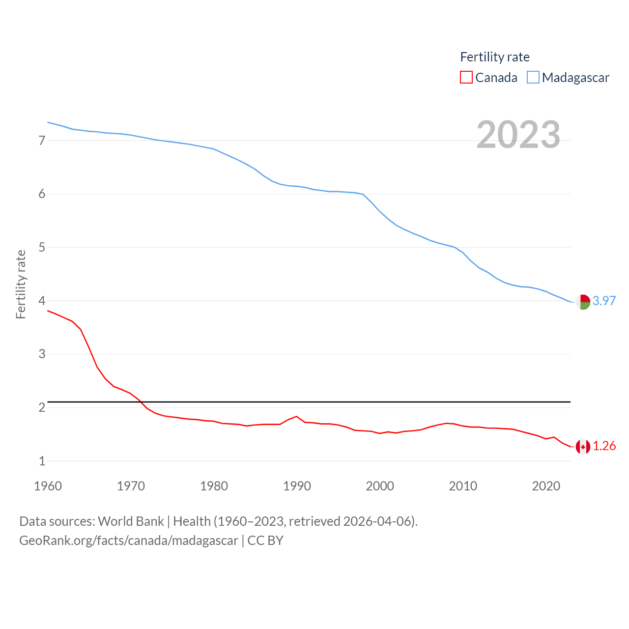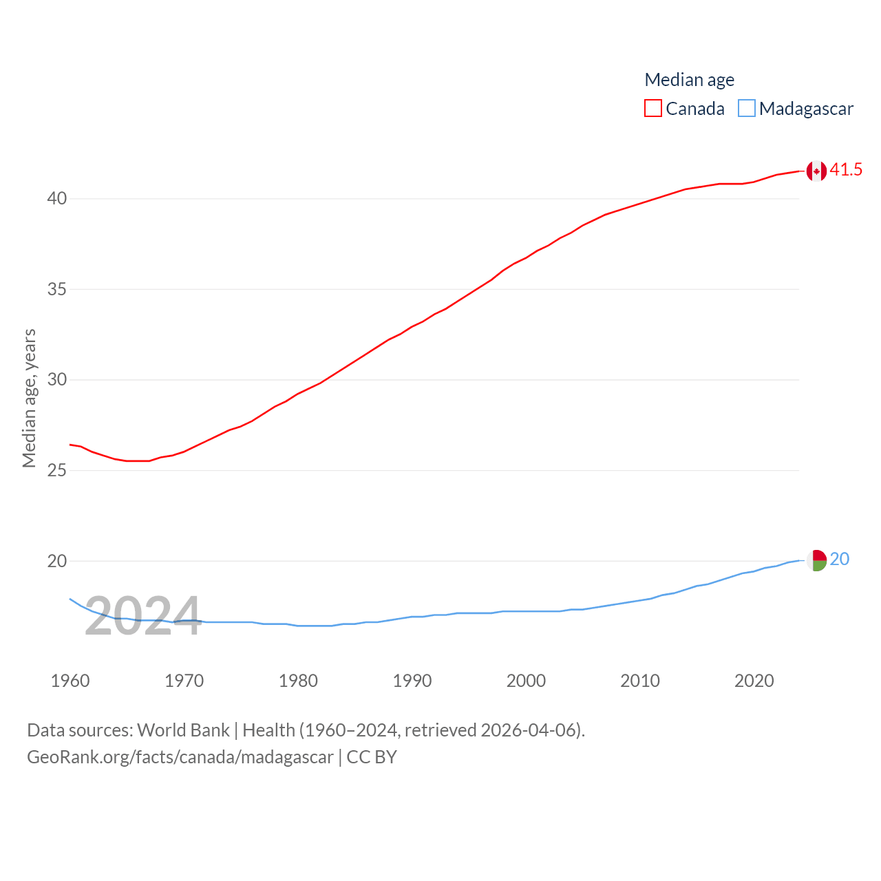 Canada has a population of 41.3M (ranked 37/197), compared with 32M in Madagascar (ranked 49/197). Canada's land area is 3,393,336 sq mi versus 224,634 sq mi for Madagascar (ranked 4th vs. 44th).