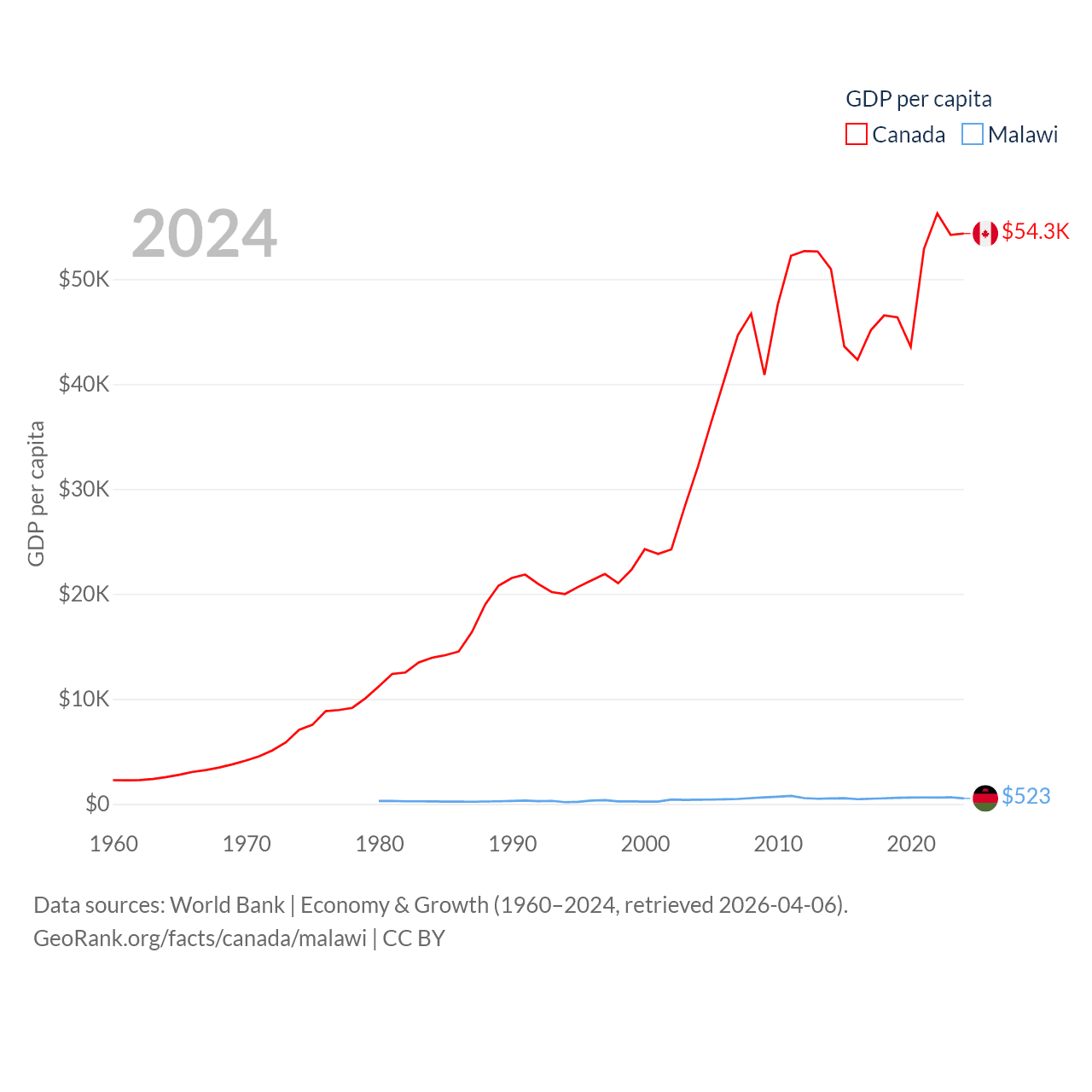 By GDP, Canada ranks 9/197 ($2.24T) and Malawi ranks 151/197 ($11.3B). By GDP per capita, Canada ranks 20/197 ($54,340), while Malawi ranks 194/197 ($523).