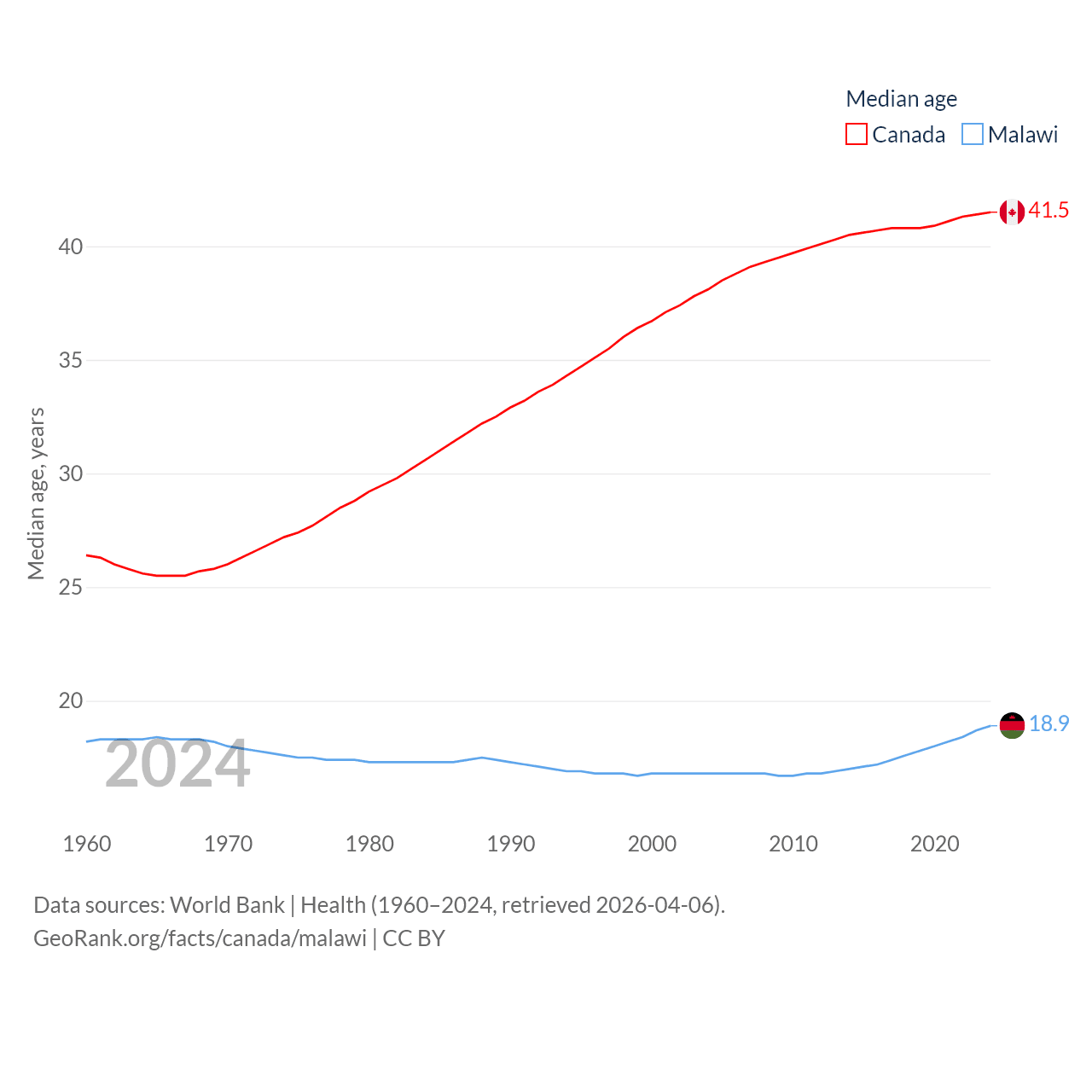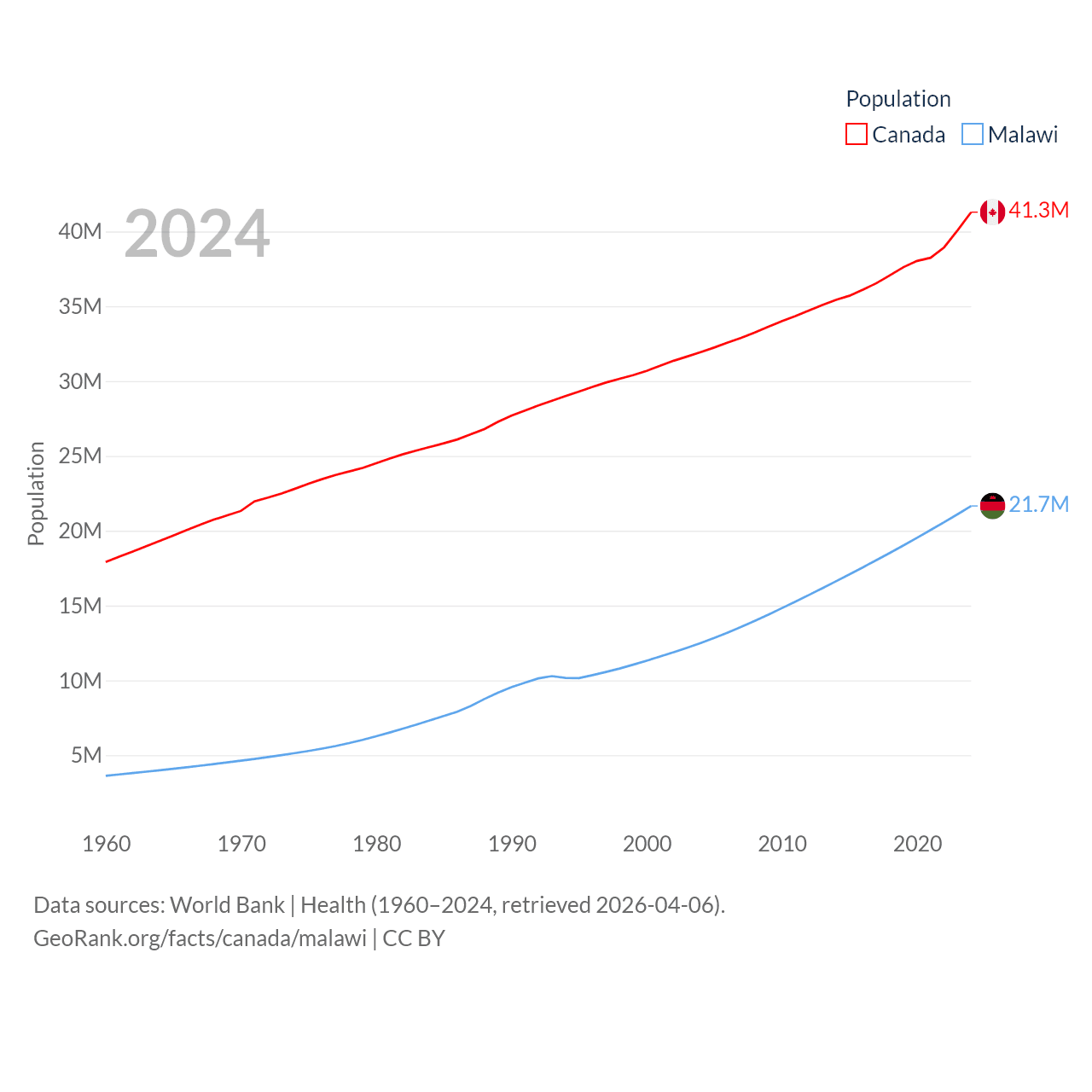 Canada has a population of 41.3M (ranked 37/197), compared with 21.7M in Malawi (ranked 62/197). Canada's land area is 3,393,336 sq mi versus 36,402 sq mi for Malawi (ranked 4th vs. 107th).