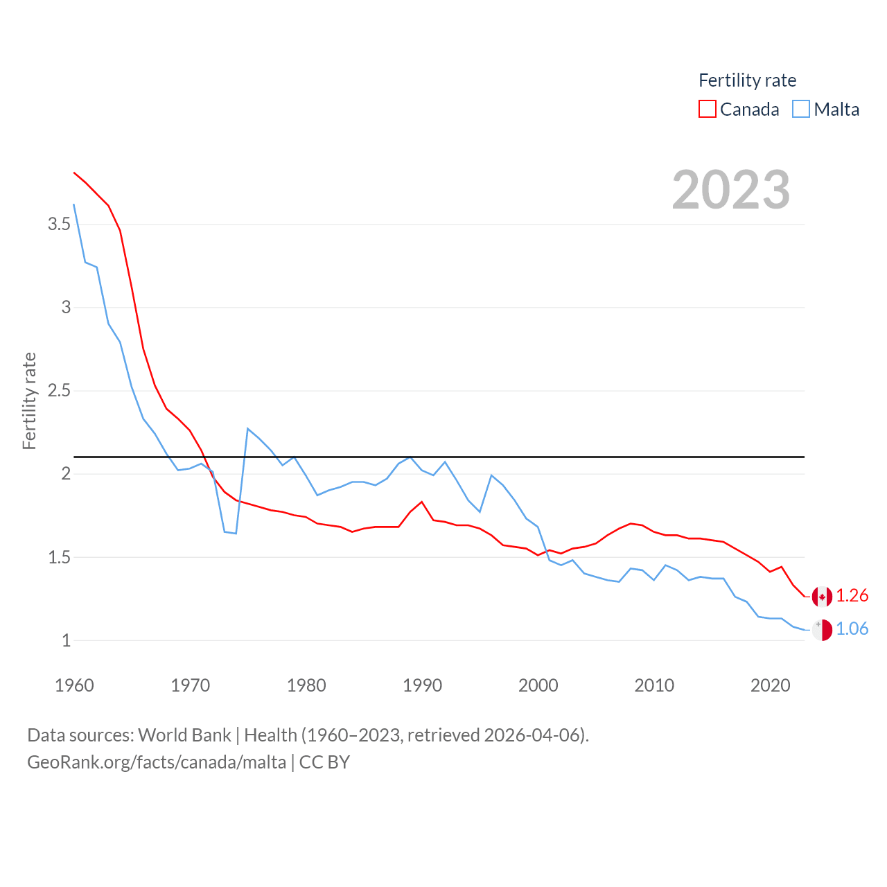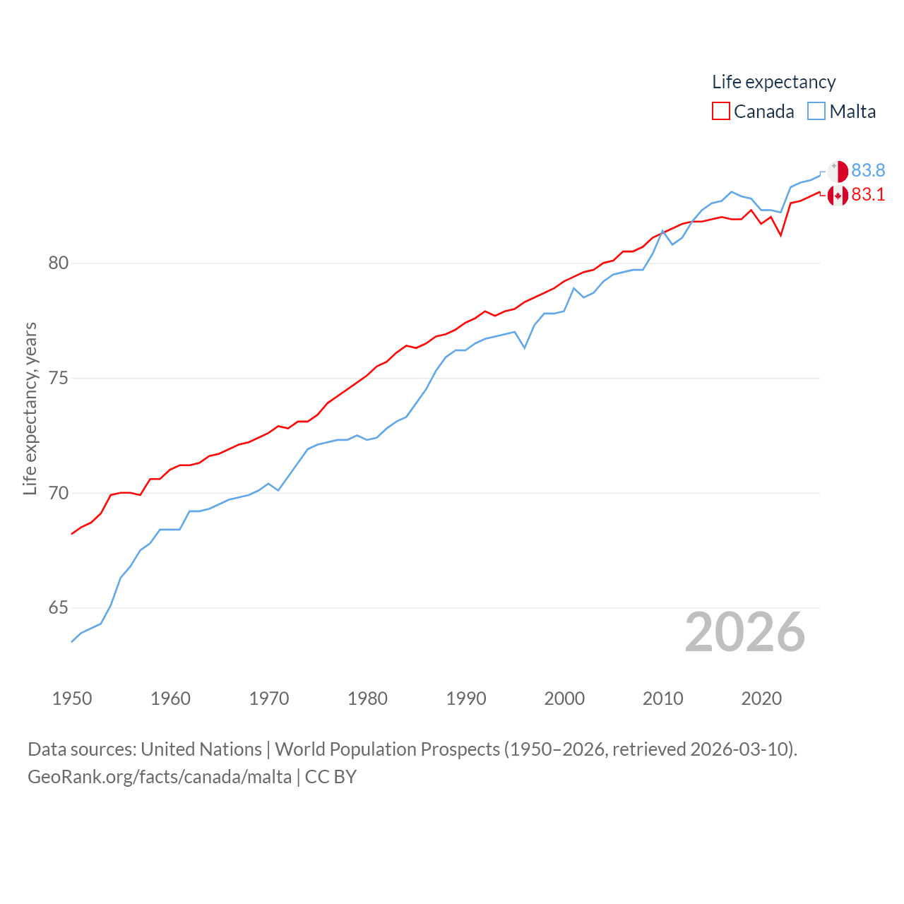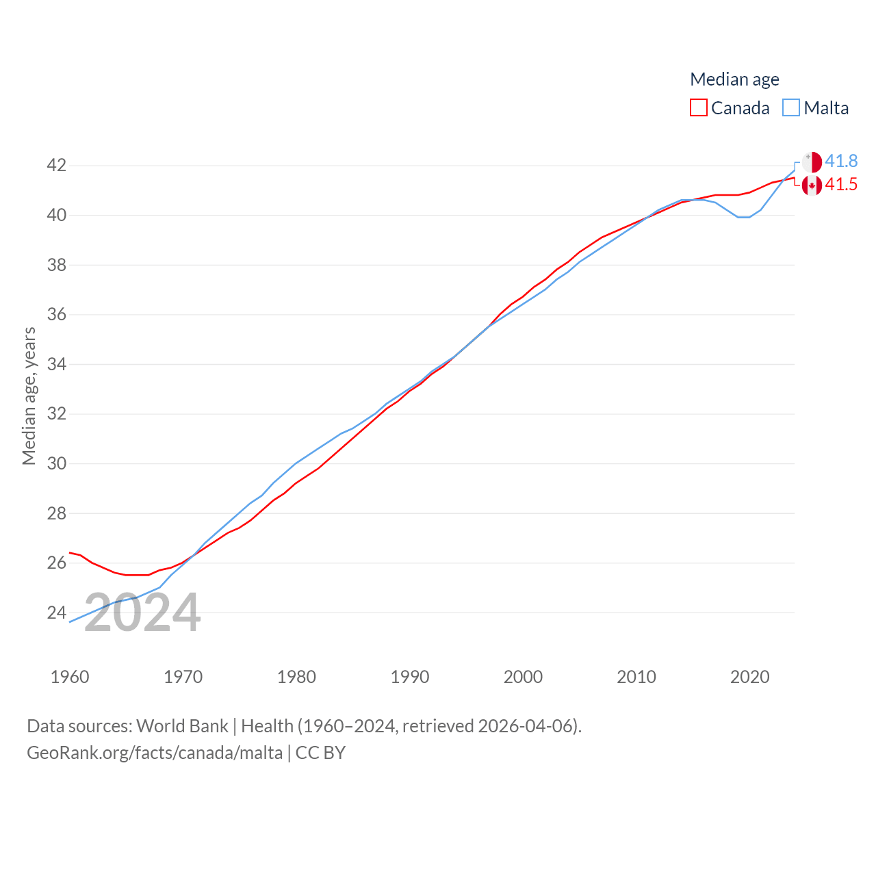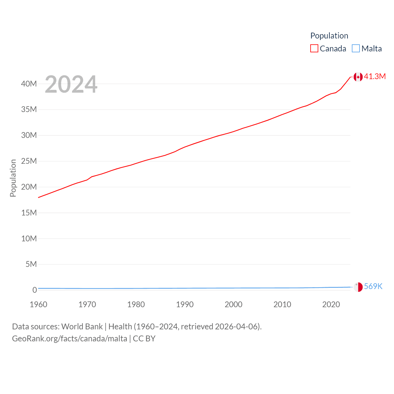 Canada has a population of 41.3M (ranked 37/197), compared with 569K in Malta (ranked 167/197). Canada's land area is 3,393,336 sq mi versus 123.6 sq mi for Malta (ranked 4th vs. 187th).