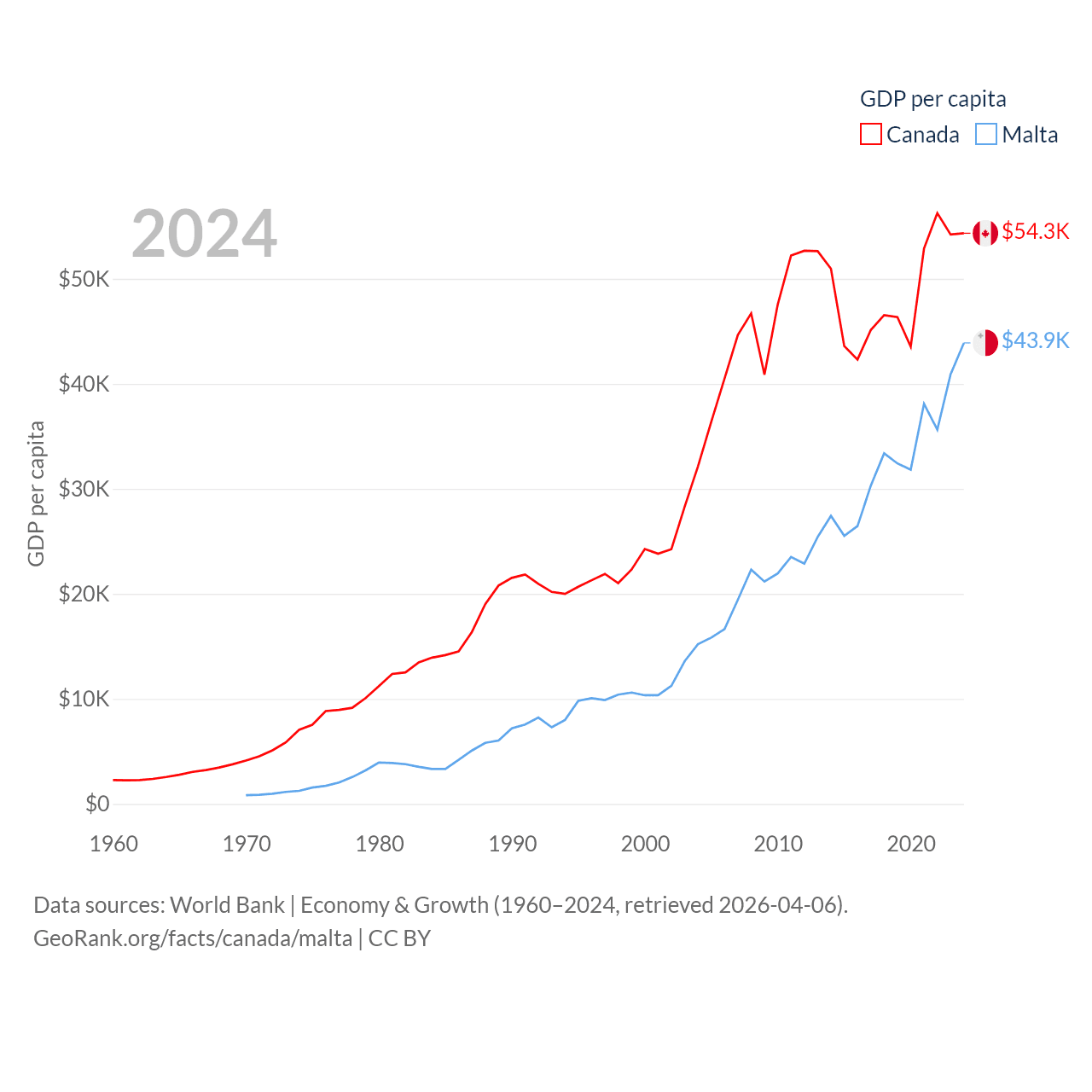 By GDP, Canada ranks 9/197 ($2.24T) and Malta ranks 119/197 ($25B). By GDP per capita, Canada ranks 20/197 ($54,340), while Malta ranks 28/197 ($43,899).
