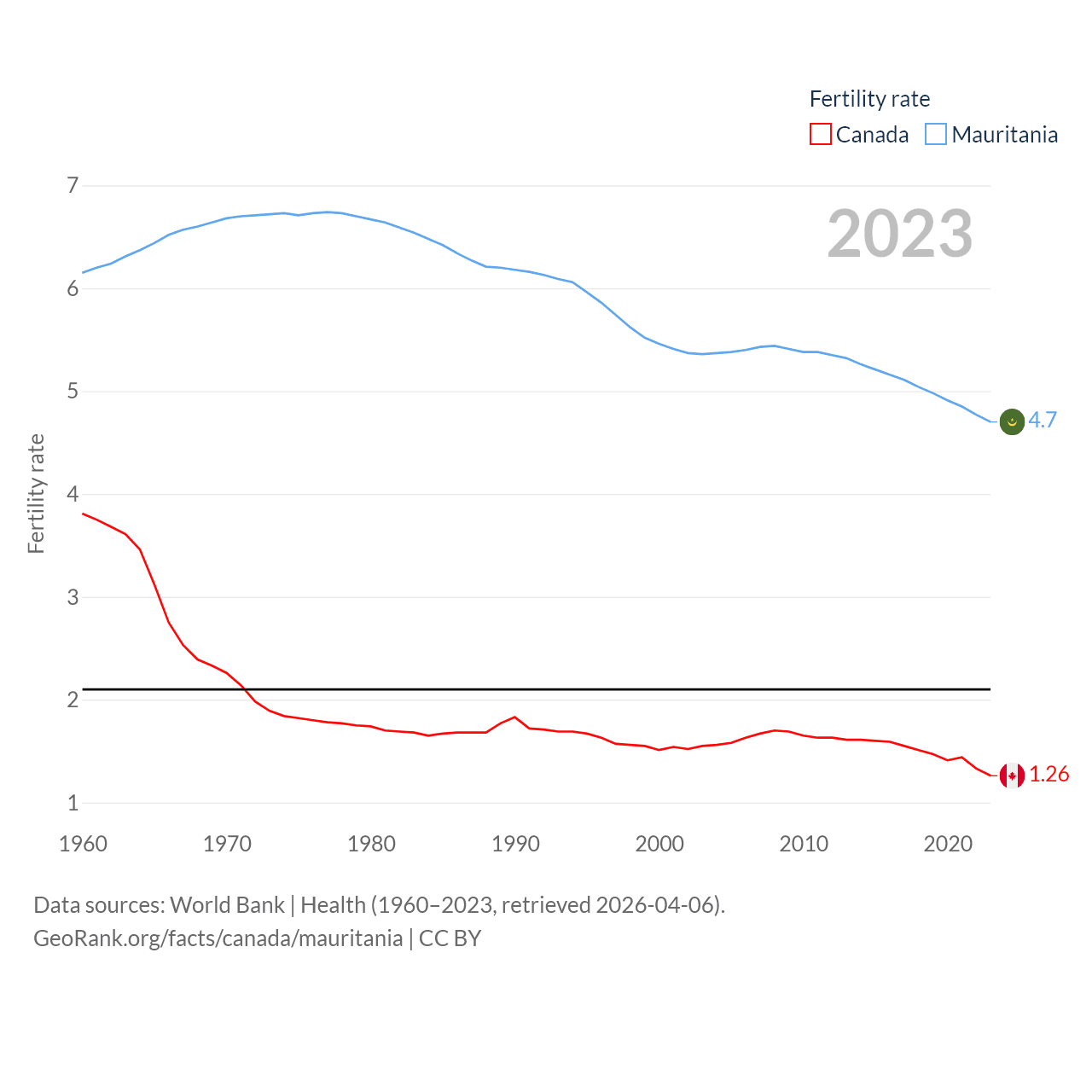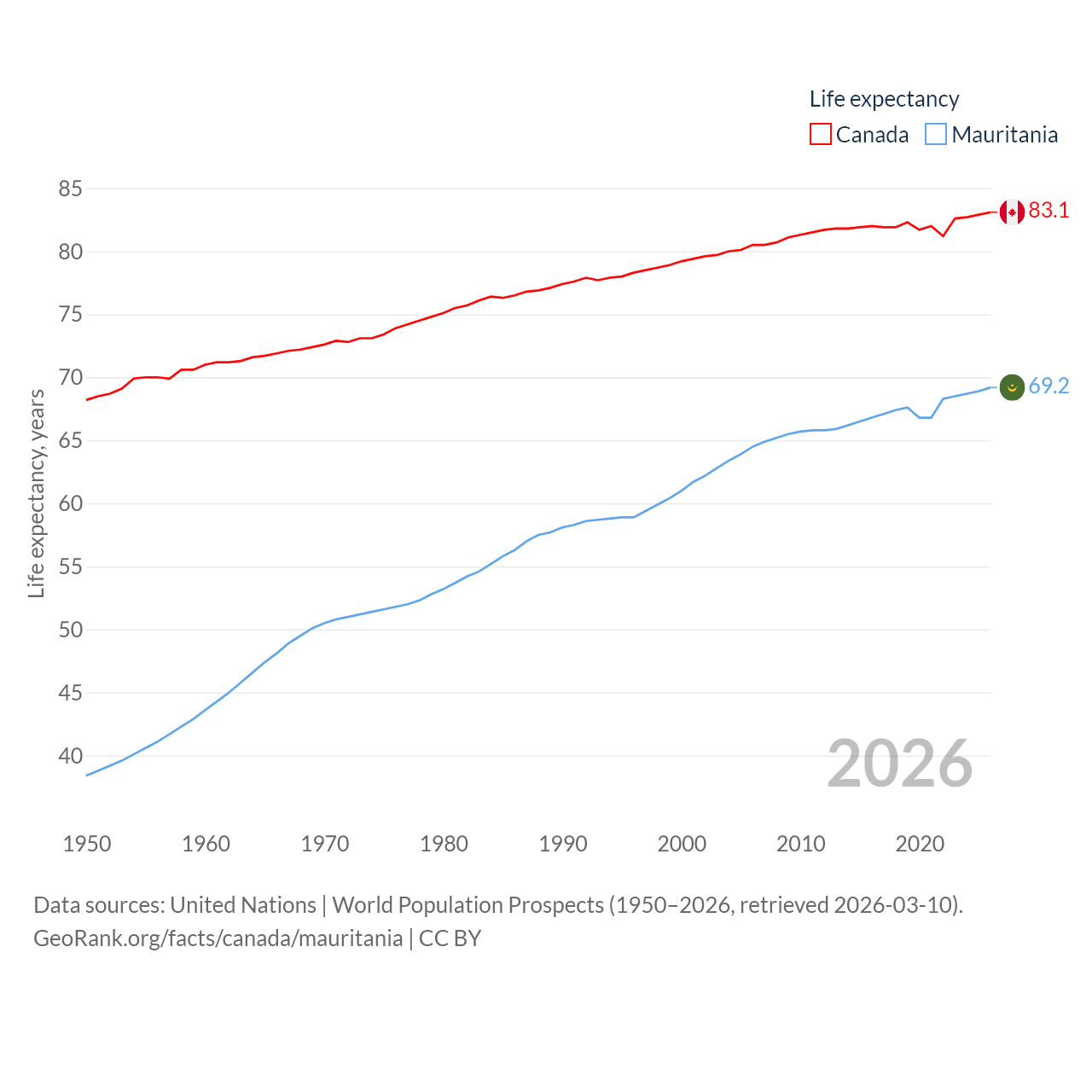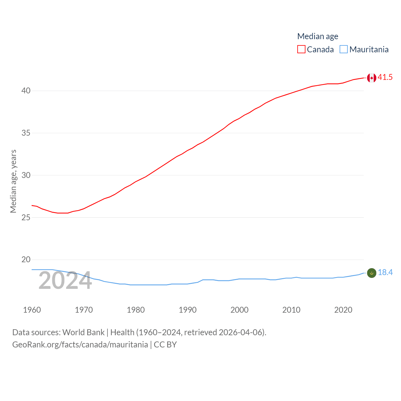 Canada has a population of 41.3M (ranked 37/197), compared with 5.17M in Mauritania (ranked 125/197). Canada's land area is 3,393,336 sq mi versus 397,955 sq mi for Mauritania (ranked 4th vs. 28th).