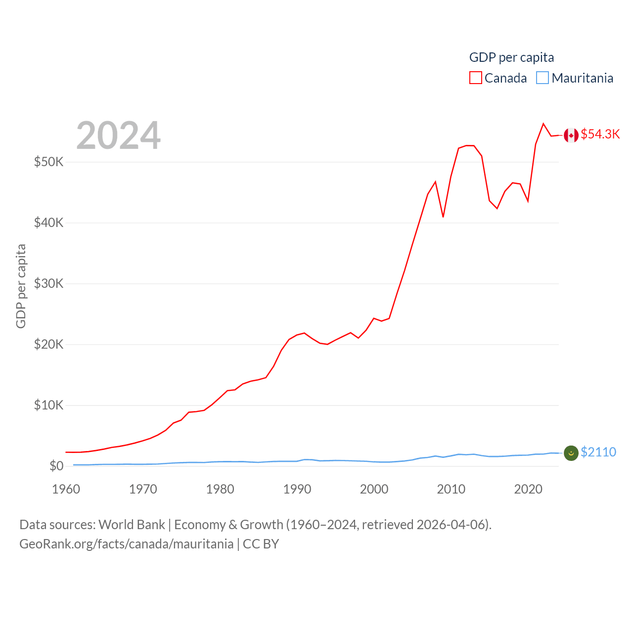 By GDP, Canada ranks 9/197 ($2.24T) and Mauritania ranks 153/197 ($10.9B). By GDP per capita, Canada ranks 20/197 ($54,340), while Mauritania ranks 156/197 ($2,110).