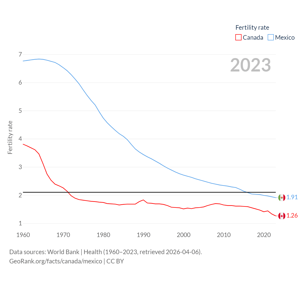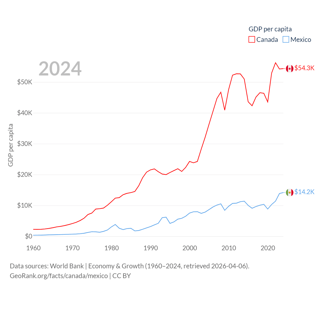 By GDP, Canada ranks 9/197 ($2.24T) and Mexico ranks 13/197 ($1.86T). By GDP per capita, Canada ranks 20/197 ($54,340), while Mexico ranks 69/197 ($14,186).