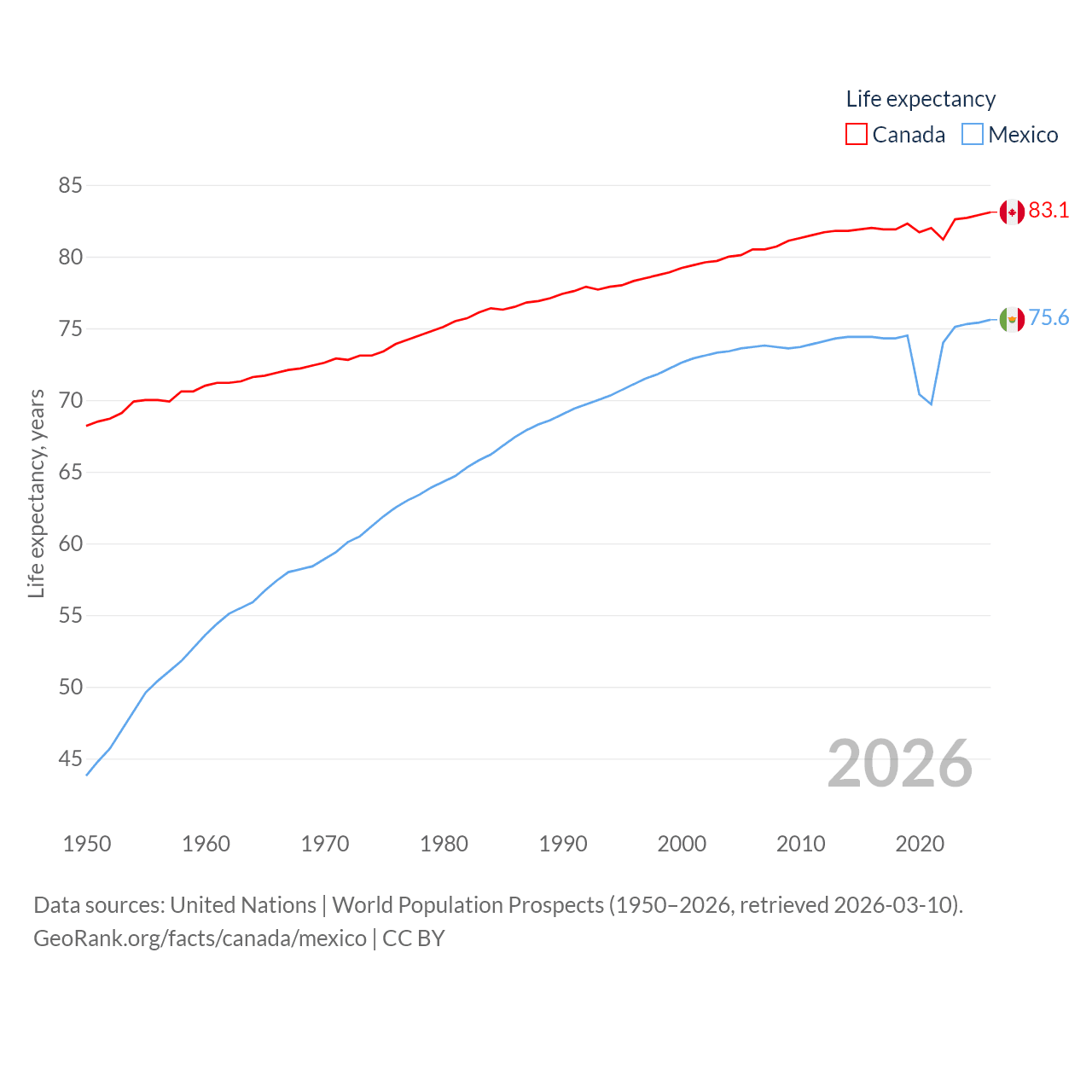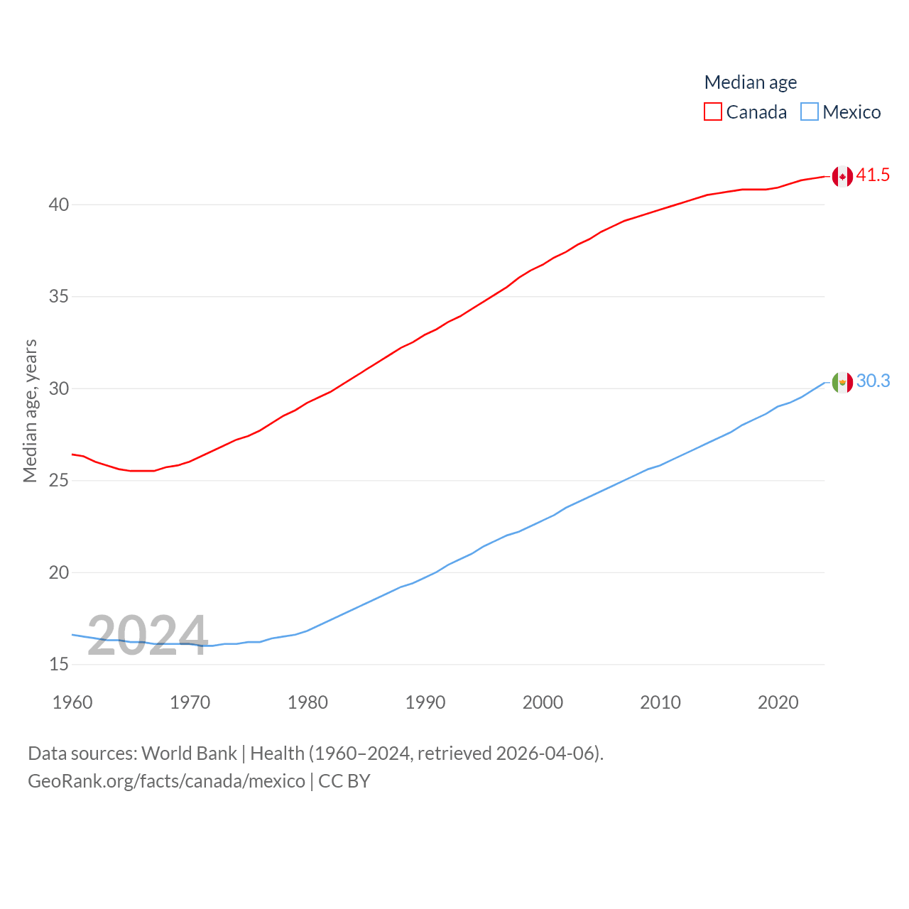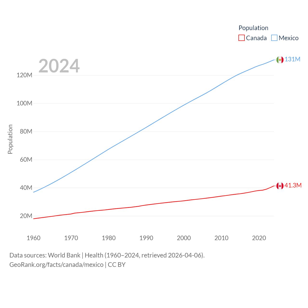 Canada has a population of 41.3M (ranked 37/197), compared with 131M in Mexico (ranked 11/197). Canada's land area is 3,393,336 sq mi versus 750,563 sq mi for Mexico (ranked 4th vs. 13th).