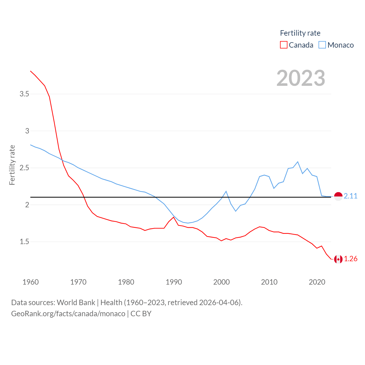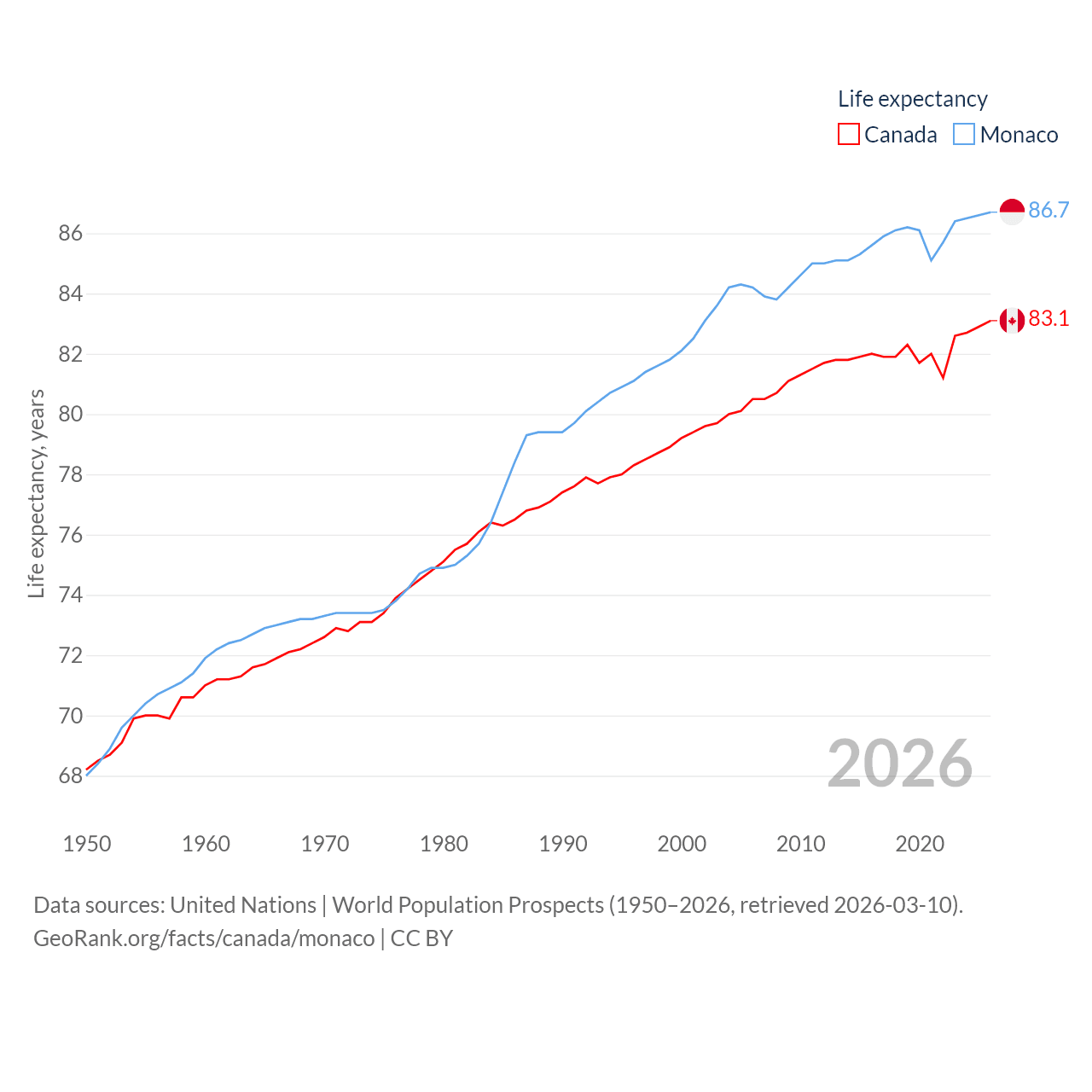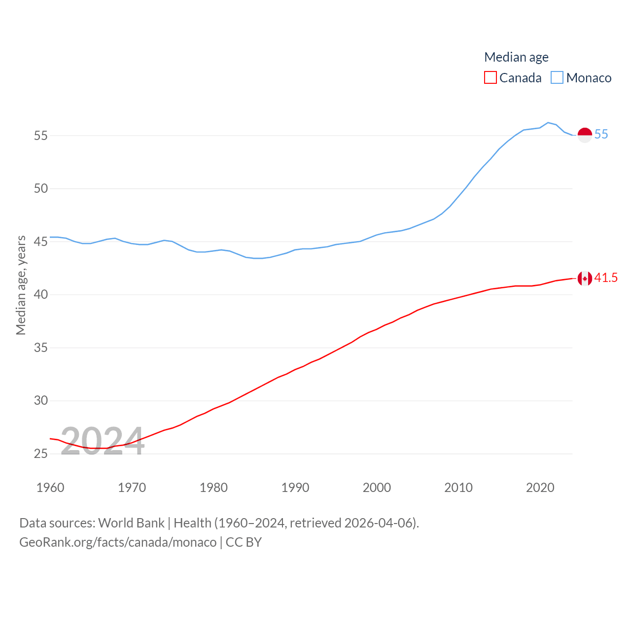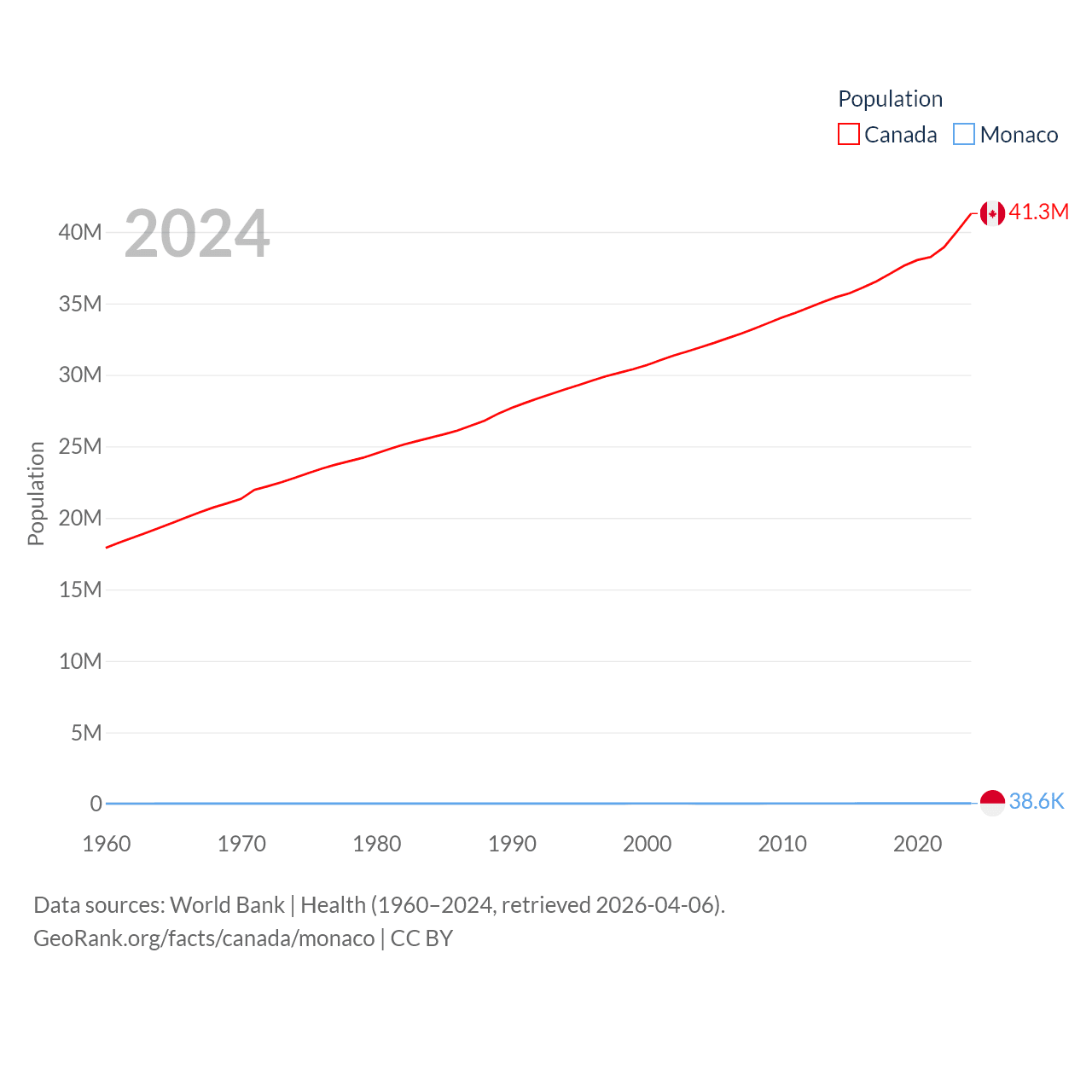Canada has a population of 41.3M (ranked 37/197), compared with 38.6K in Monaco (ranked 191/197). Canada's land area is 3,393,336 sq mi versus 0.8 sq mi for Monaco (ranked 4th vs. 196th).