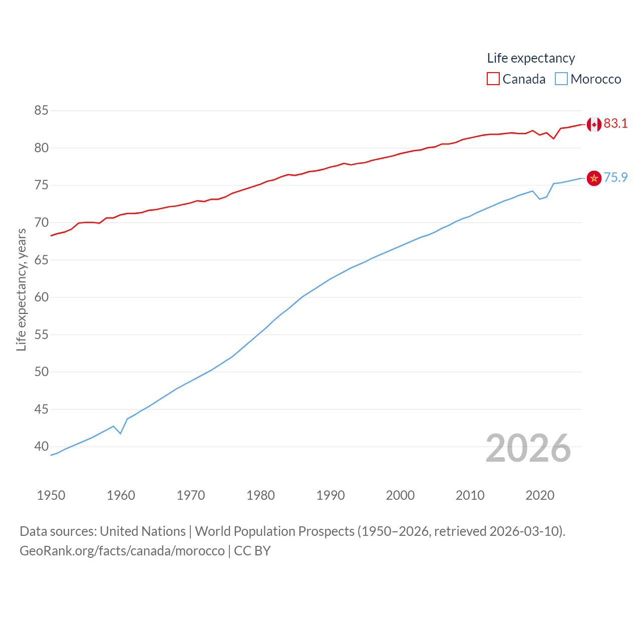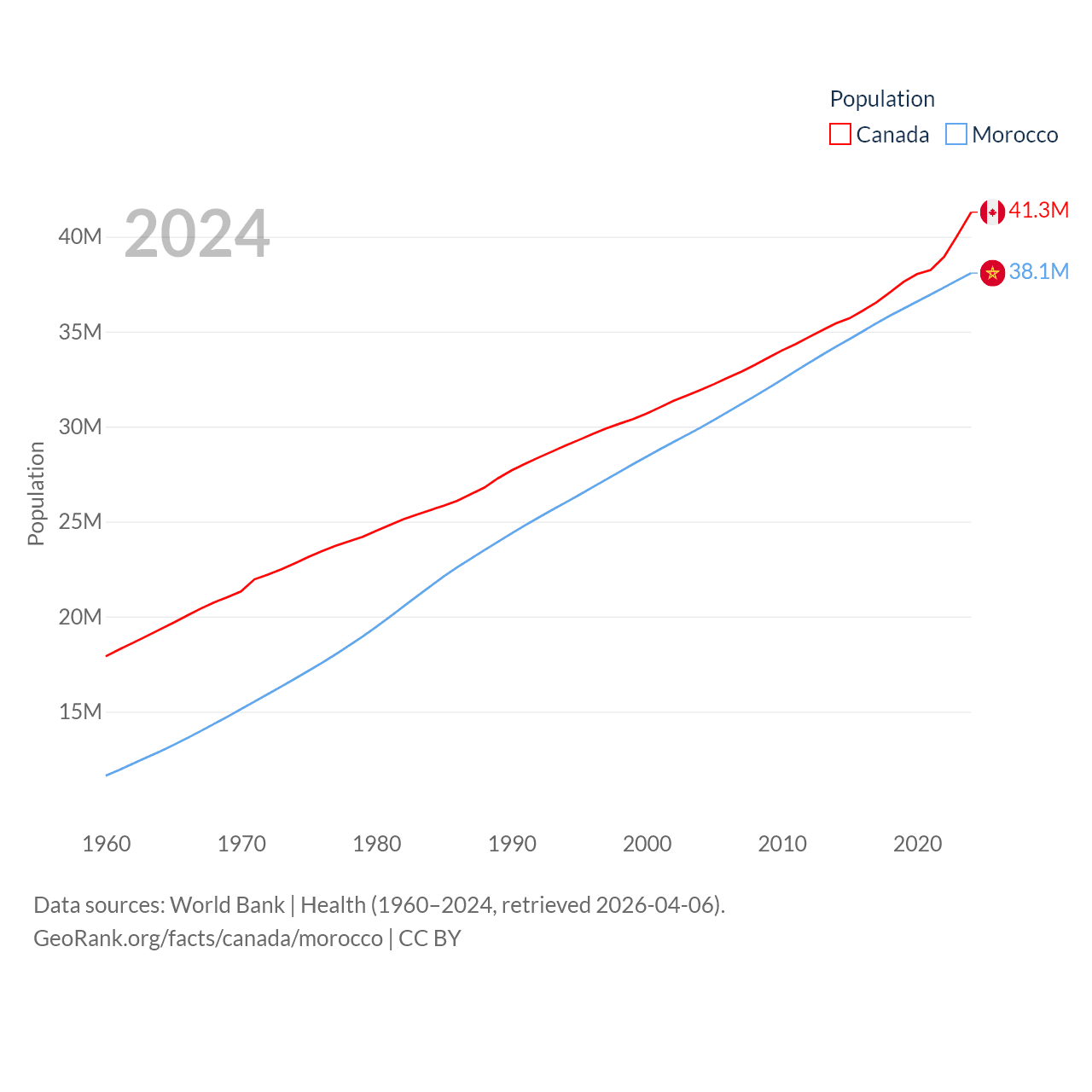 Canada has a population of 41.3M (ranked 37/197), compared with 38.1M in Morocco (ranked 39/197). Canada's land area is 3,393,336 sq mi versus 172,317 sq mi for Morocco (ranked 4th vs. 55th).
