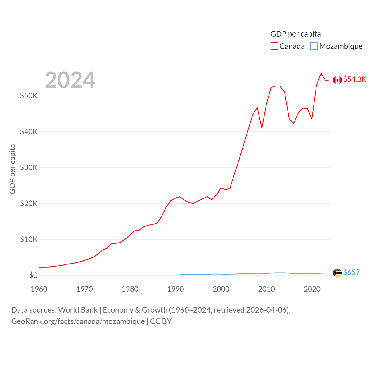 By GDP, Canada ranks 9/197 ($2.24T) and Mozambique ranks 123/197 ($22.7B). By GDP per capita, Canada ranks 20/197 ($54,340), while Mozambique ranks 189/197 ($657).