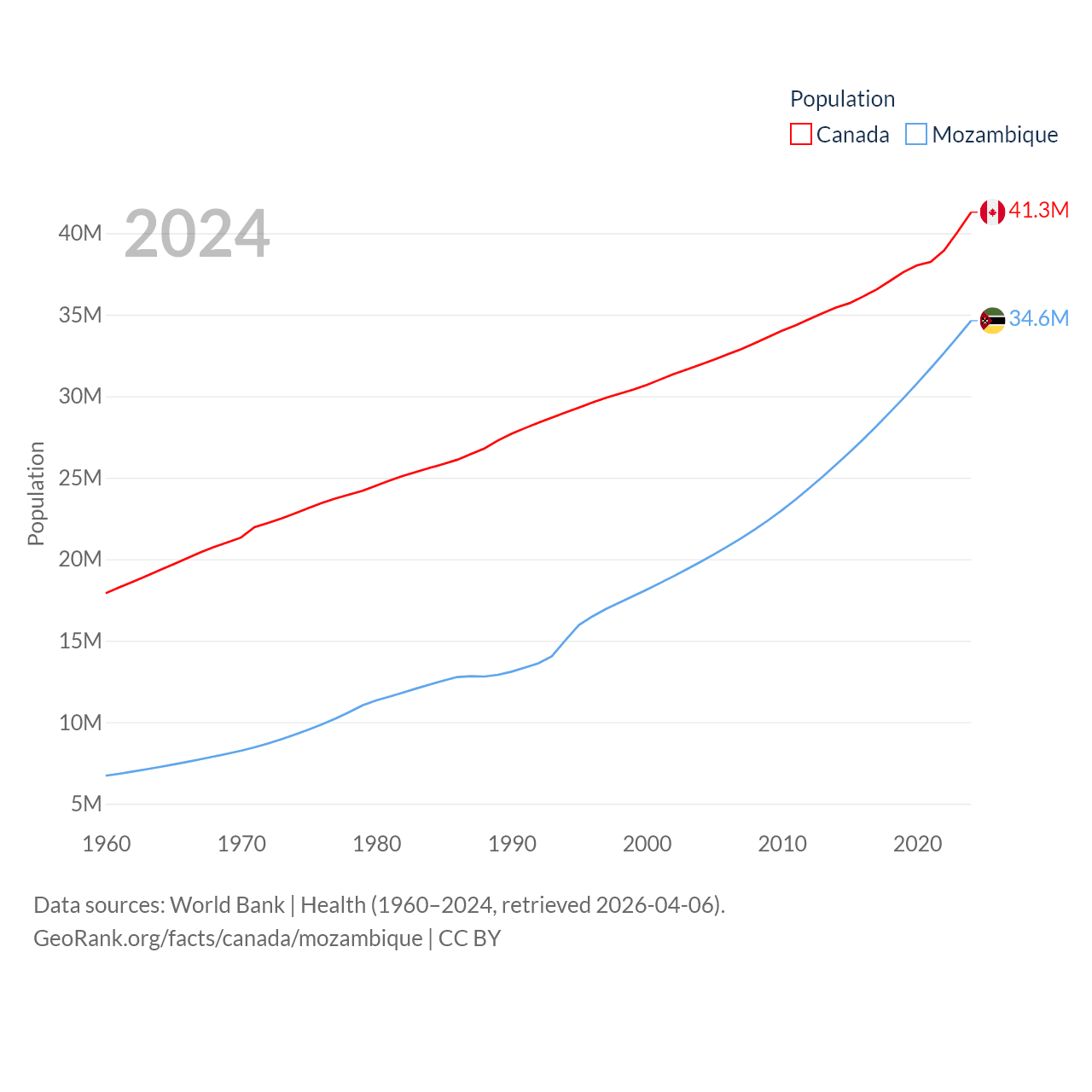 Canada has a population of 41.3M (ranked 37/197), compared with 34.6M in Mozambique (ranked 46/197). Canada's land area is 3,393,336 sq mi versus 303,623 sq mi for Mozambique (ranked 4th vs. 34th).