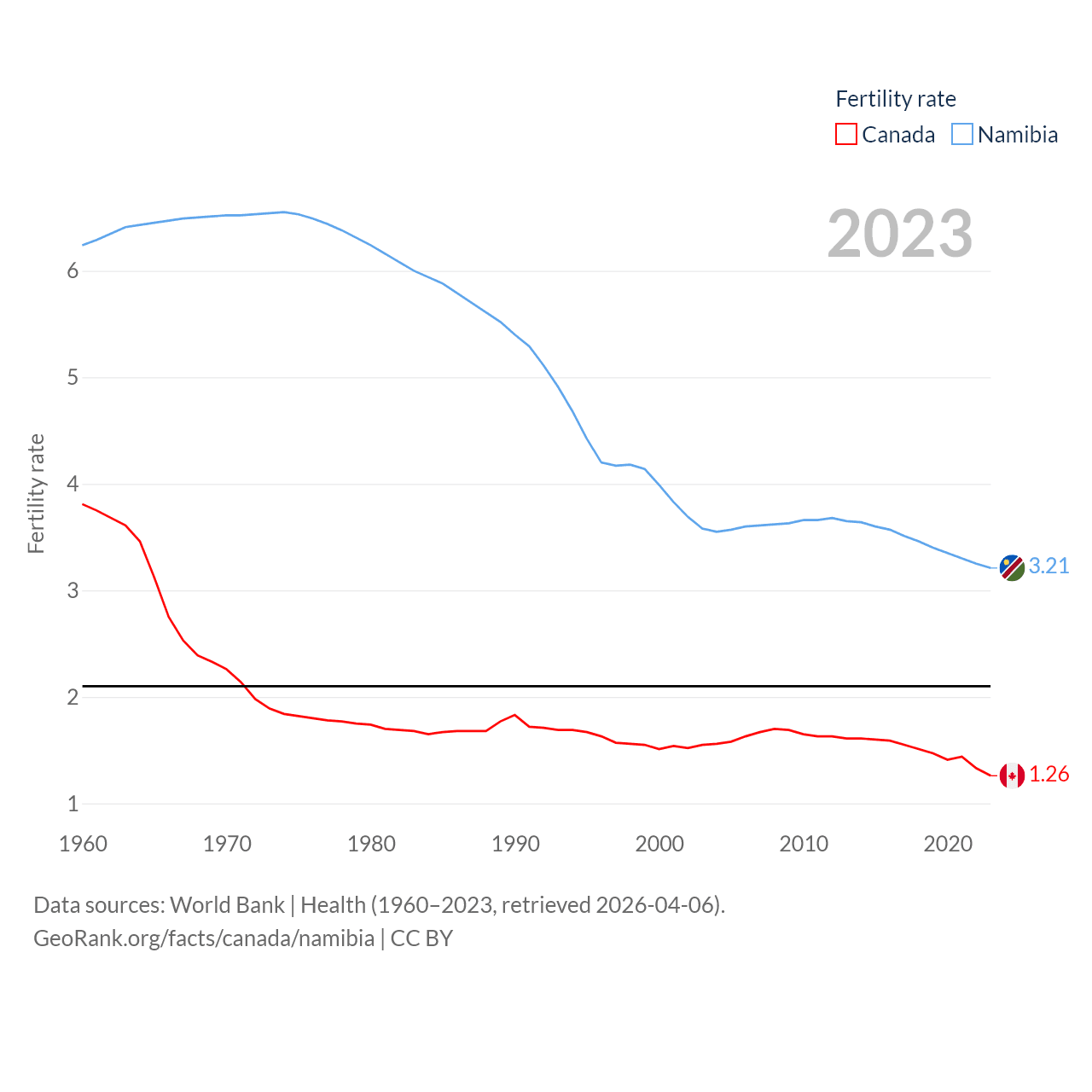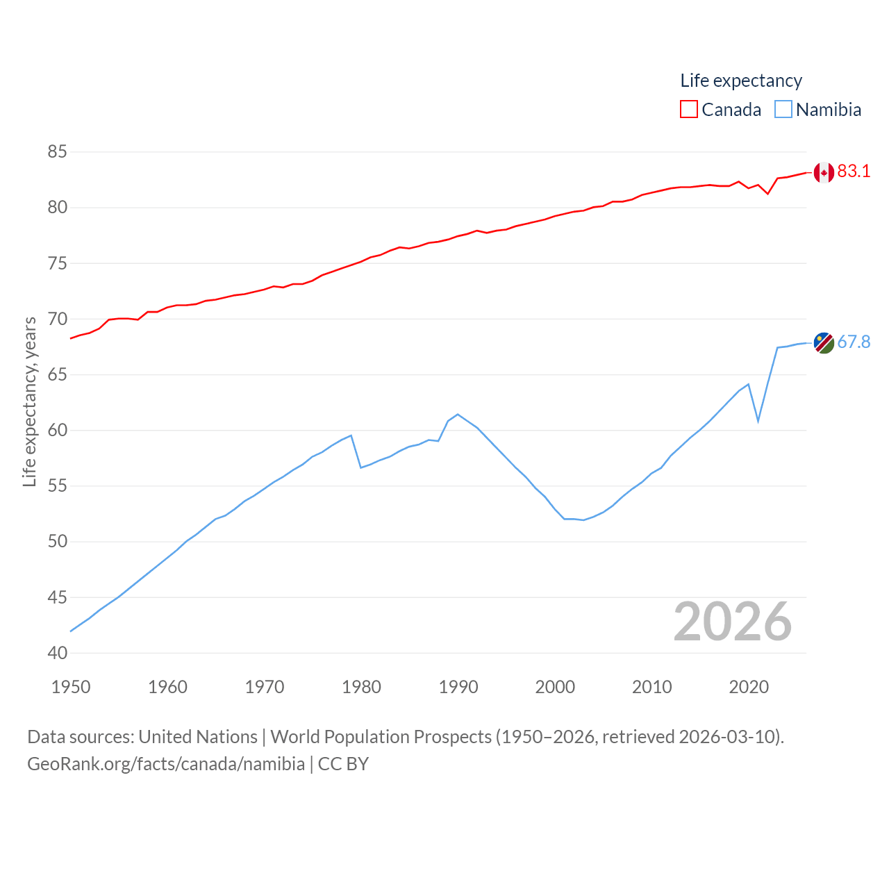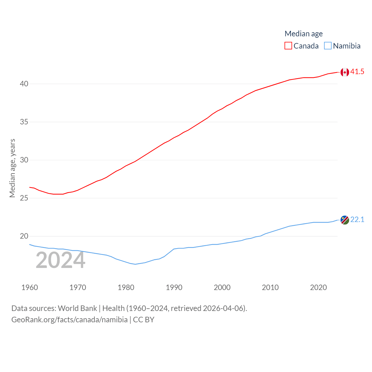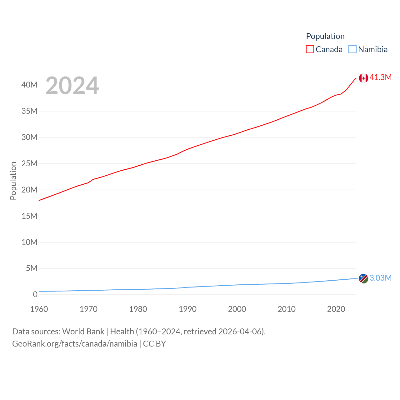 Canada has a population of 41.3M (ranked 37/197), compared with 3.03M in Namibia (ranked 136/197). Canada's land area is 3,393,336 sq mi versus 317,874 sq mi for Namibia (ranked 4th vs. 33rd).
