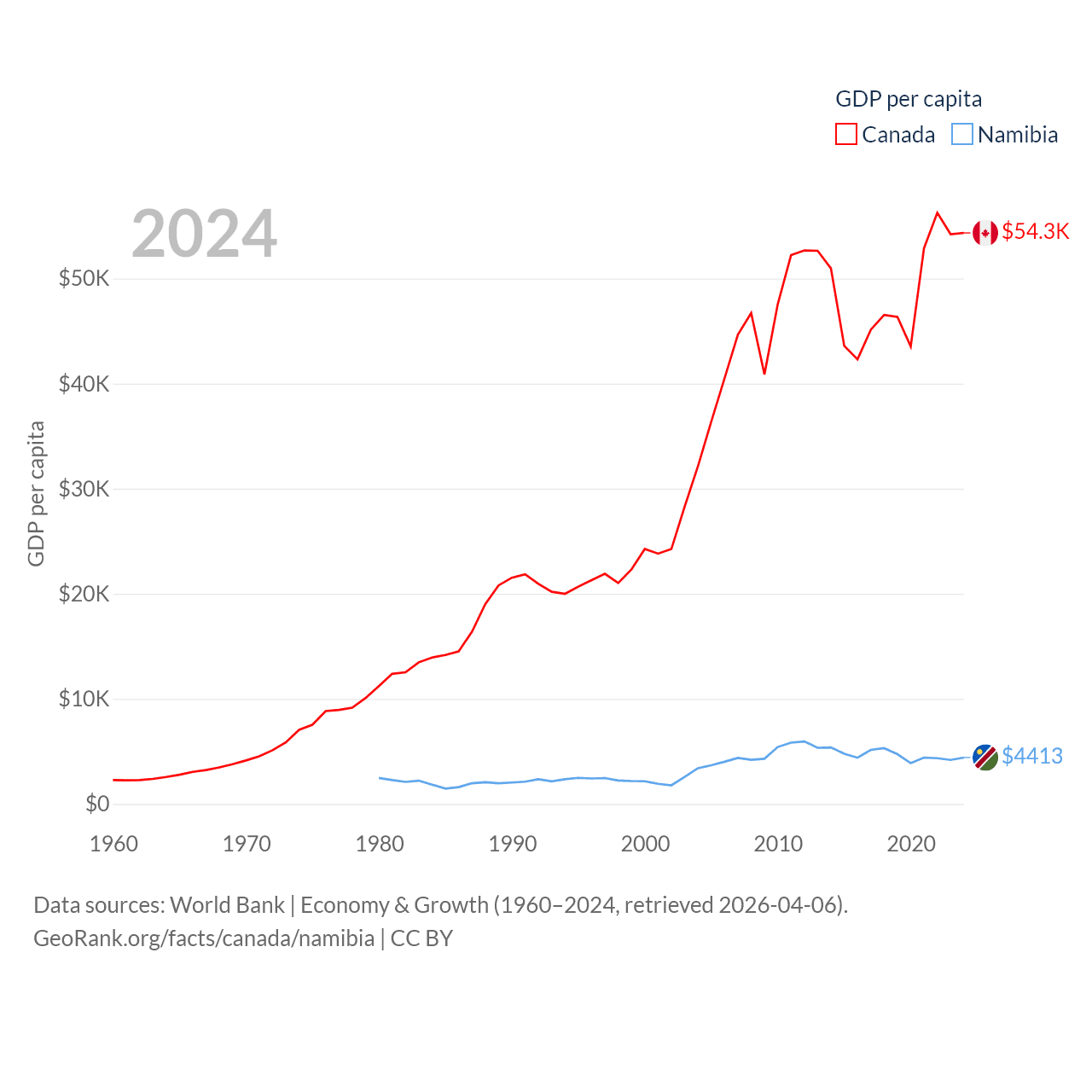 By GDP, Canada ranks 9/197 ($2.24T) and Namibia ranks 147/197 ($13.4B). By GDP per capita, Canada ranks 20/197 ($54,340), while Namibia ranks 126/197 ($4,413).