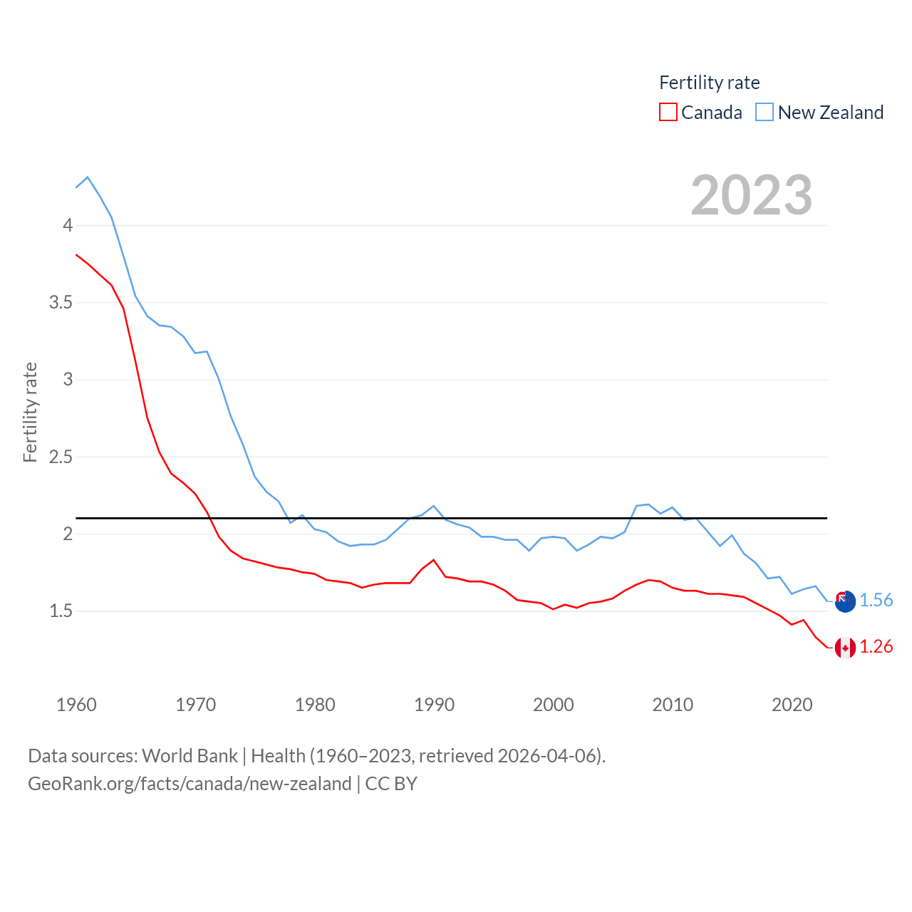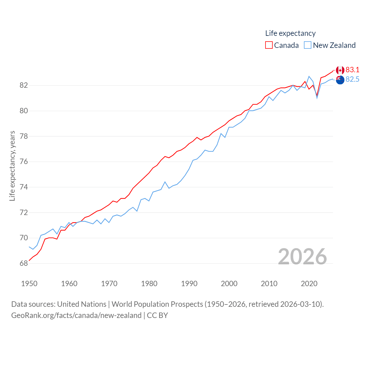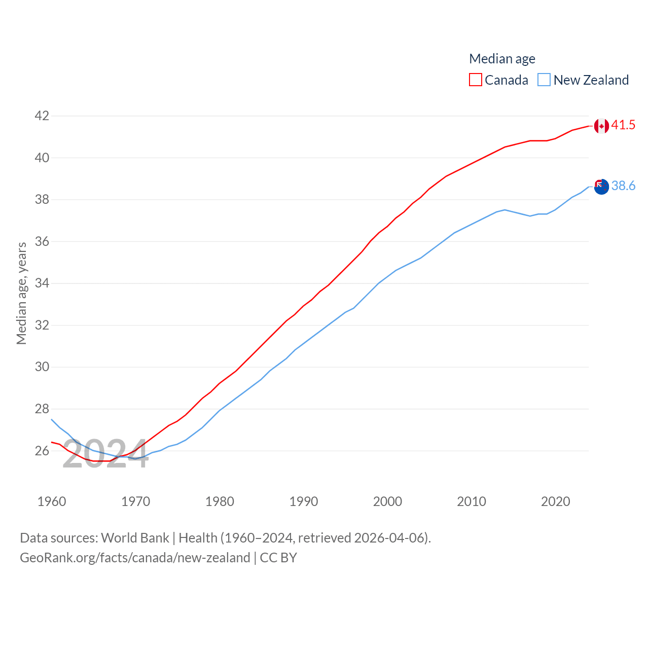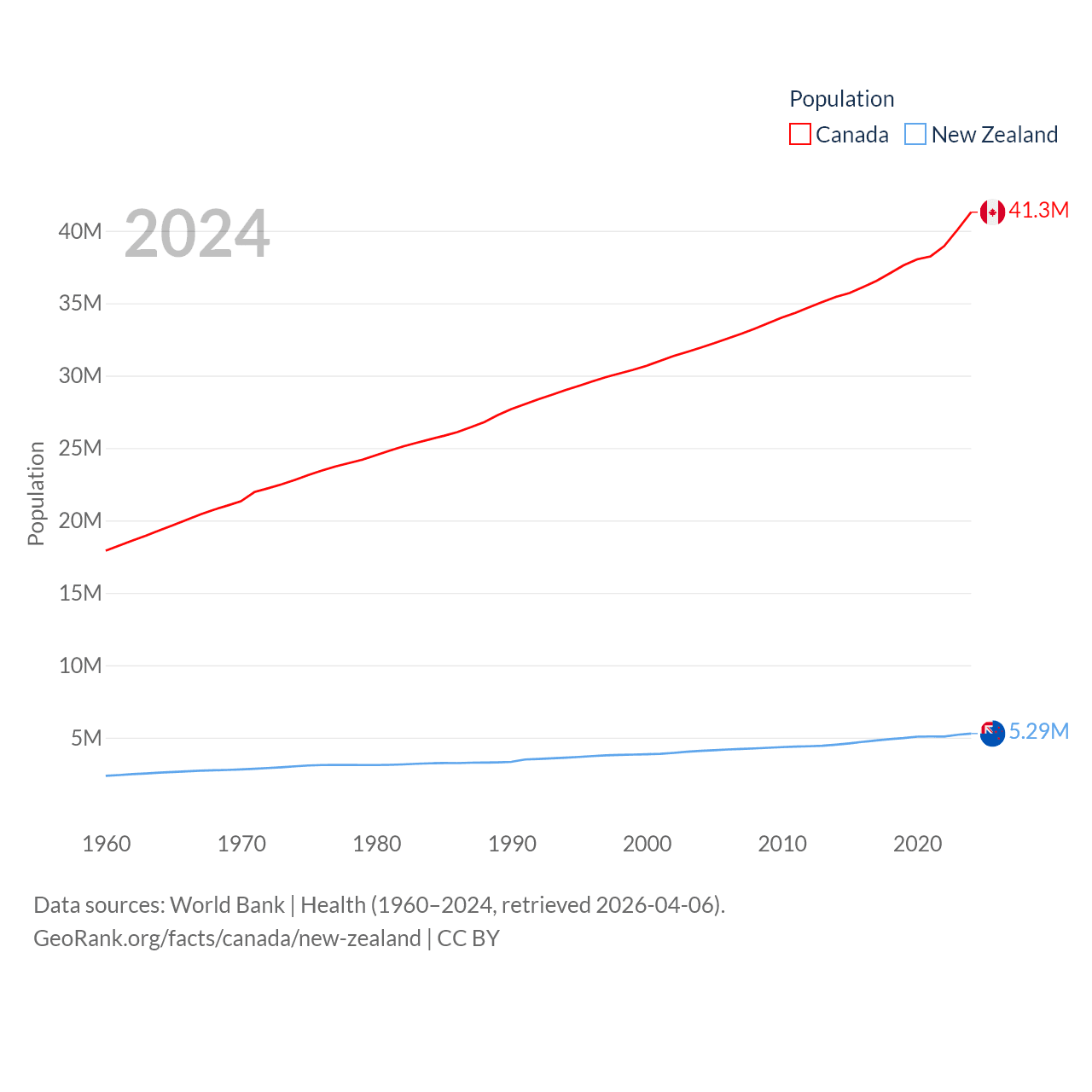 Canada has a population of 41.3M (ranked 37/197), compared with 5.29M in New Zealand (ranked 123/197). Canada's land area is 3,393,336 sq mi versus 101,665 sq mi for New Zealand (ranked 4th vs. 74th).