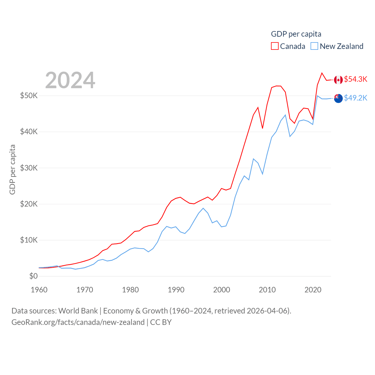 By GDP, Canada ranks 9/197 ($2.24T) and New Zealand ranks 52/197 ($260B). By GDP per capita, Canada ranks 20/197 ($54,340), while New Zealand ranks 26/197 ($49,205).
