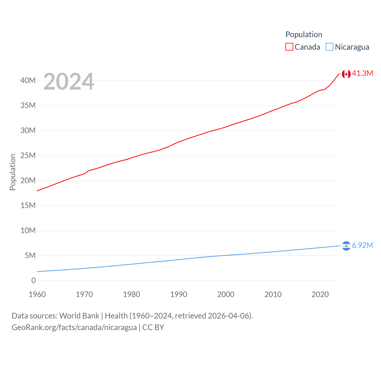 Canada has a population of 41.3M (ranked 37/197), compared with 6.92M in Nicaragua (ranked 108/197). Canada's land area is 3,393,336 sq mi versus 46,464 sq mi for Nicaragua (ranked 4th vs. 98th).