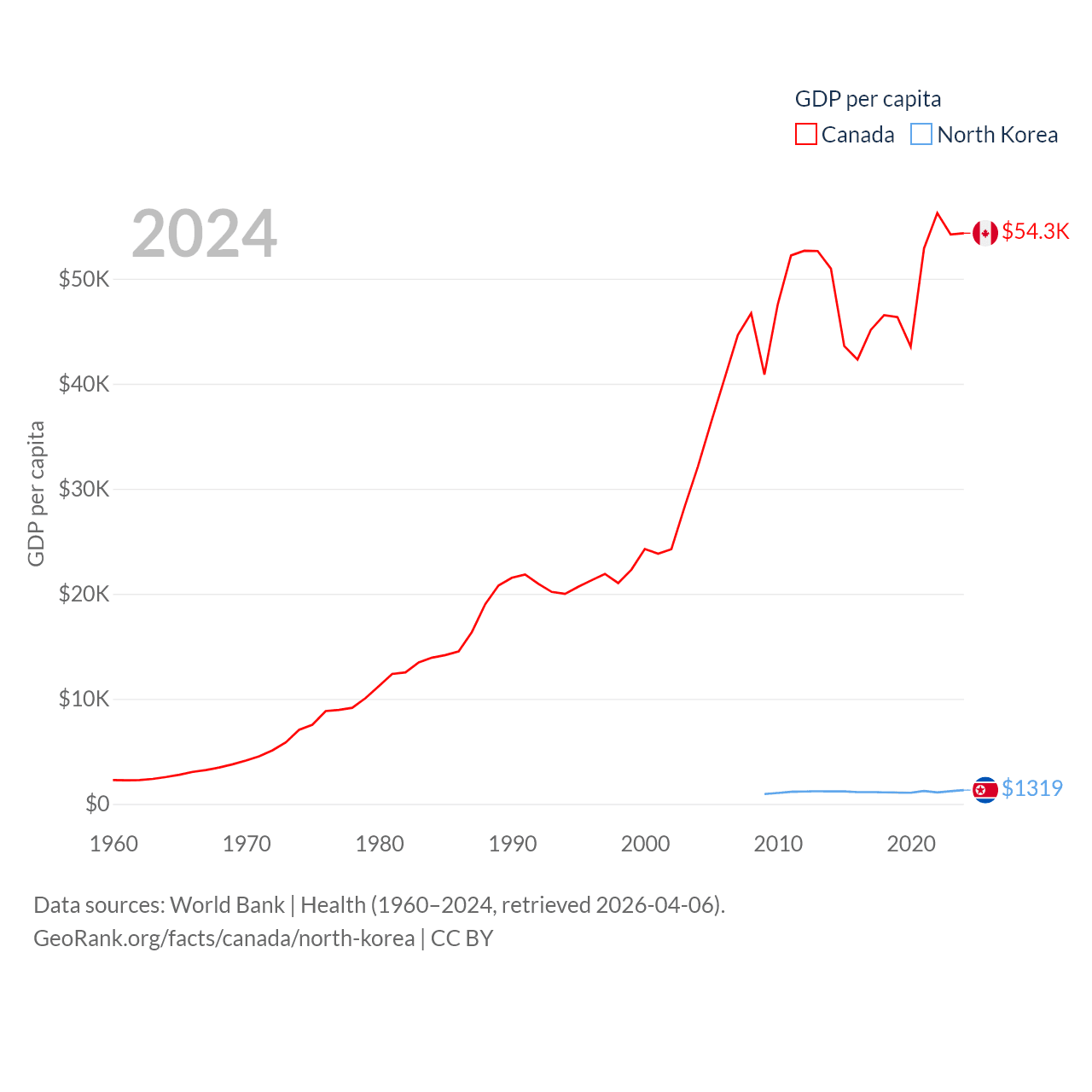 By GDP, Canada ranks 9/197 ($2.24T) and North Korea ranks 106/197 ($34.9B). By GDP per capita, Canada ranks 20/197 ($54,340), while North Korea ranks 168/197 ($1,319).