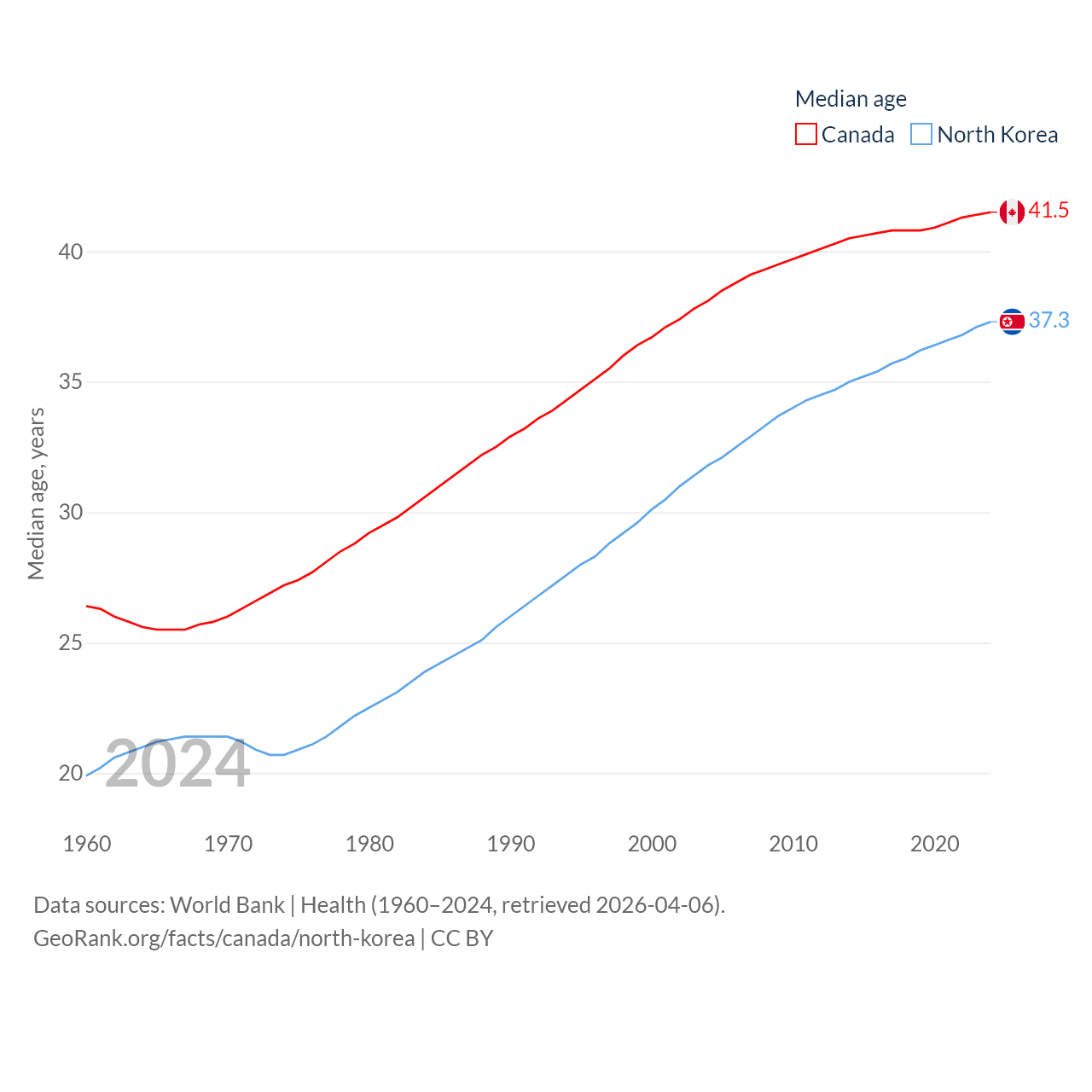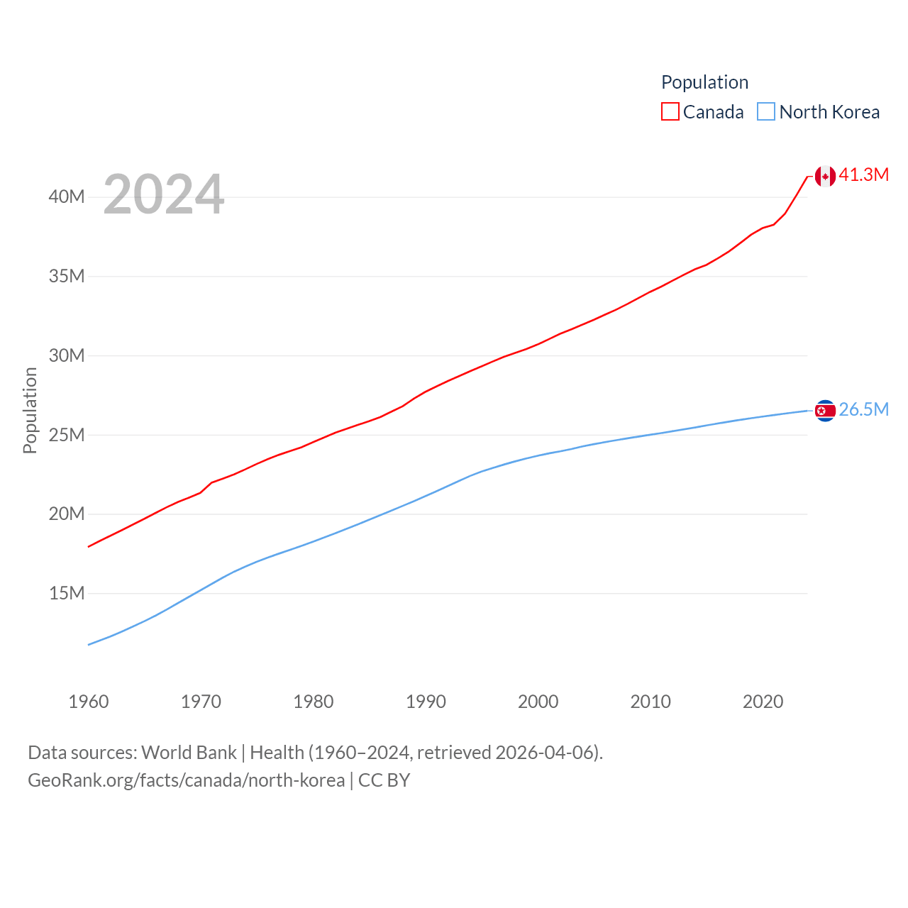 Canada has a population of 41.3M (ranked 37/197), compared with 26.5M in North Korea (ranked 56/197). Canada's land area is 3,393,336 sq mi versus 46,491 sq mi for North Korea (ranked 4th vs. 97th).