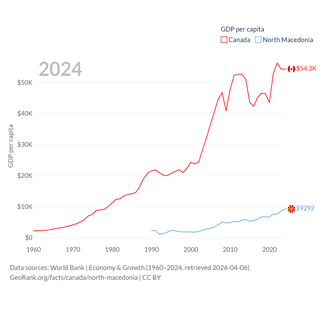By GDP, Canada ranks 9/197 ($2.24T) and North Macedonia ranks 138/197 ($17B). By GDP per capita, Canada ranks 20/197 ($54,340), while North Macedonia ranks 88/197 ($9,292).