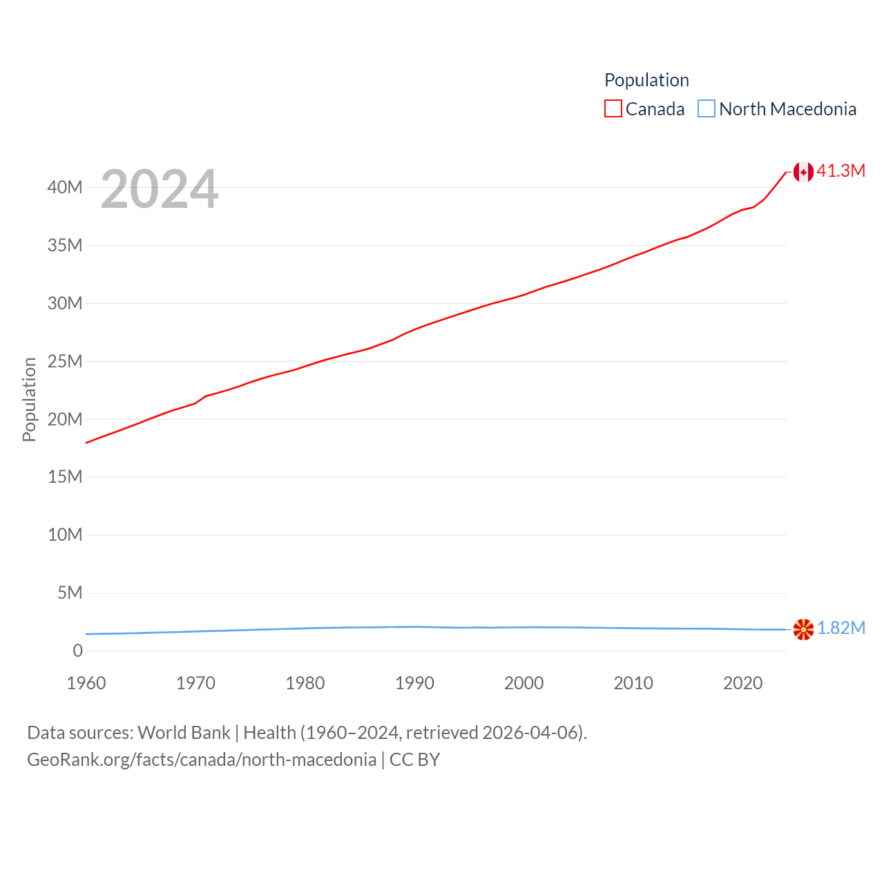 Canada has a population of 41.3M (ranked 37/197), compared with 1.82M in North Macedonia (ranked 150/197). Canada's land area is 3,393,336 sq mi versus 9,737 sq mi for North Macedonia (ranked 4th vs. 145th).